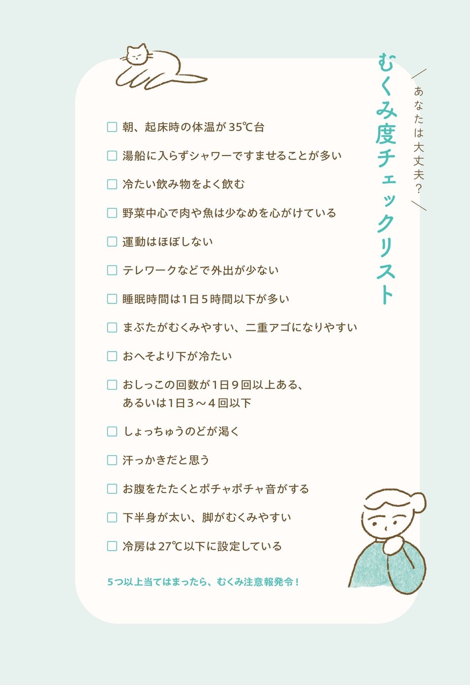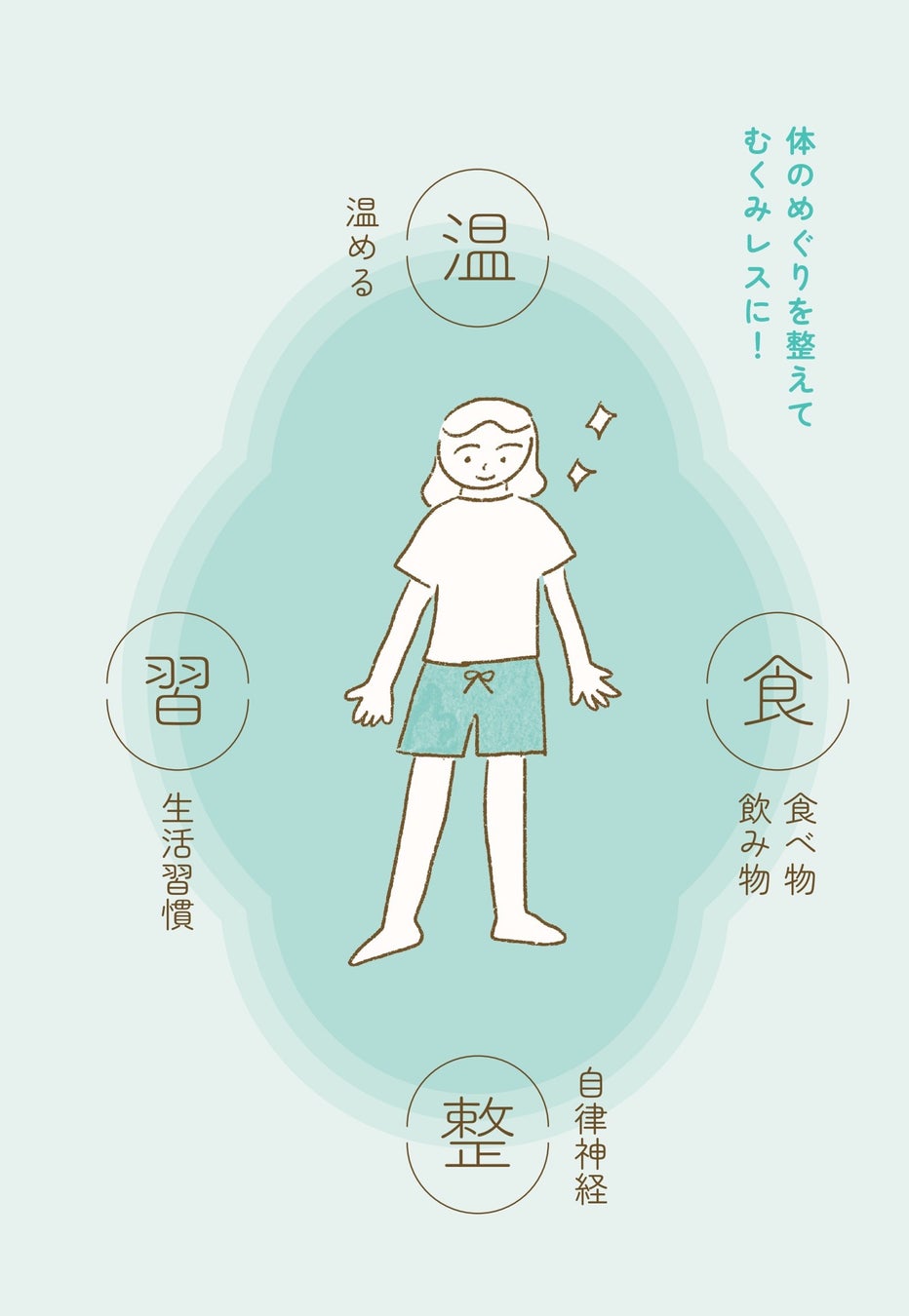本書では、「むくみをなんとかしたい!」「むくまない体になりたい!」と日々のむくみに悩む女性たちのために「むくみをとる」「むくみにくくなる」コツとアイデアを紹介。どれもちょっとしたことで、簡単にできるケアばかり。「断つこと、やめることが苦手な人」も「めんどくさがりなズボラさん」にも簡単!「食べて“むくみとり”する方法」や「日常に少しとり入れるだけ」で解消できる方法を徹底解説しています。さらに、「水一日2ℓはマストではない」「ビールのホップがむくみとりをサポートする」など、目からウロコな新常識もジャンル別に紹介!