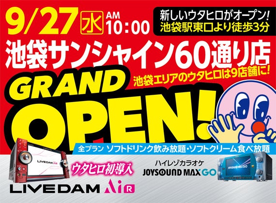 【カラオケルーム歌広場】9/27(水)AM10時『池袋サンシャイン60通り店』新規オープン!