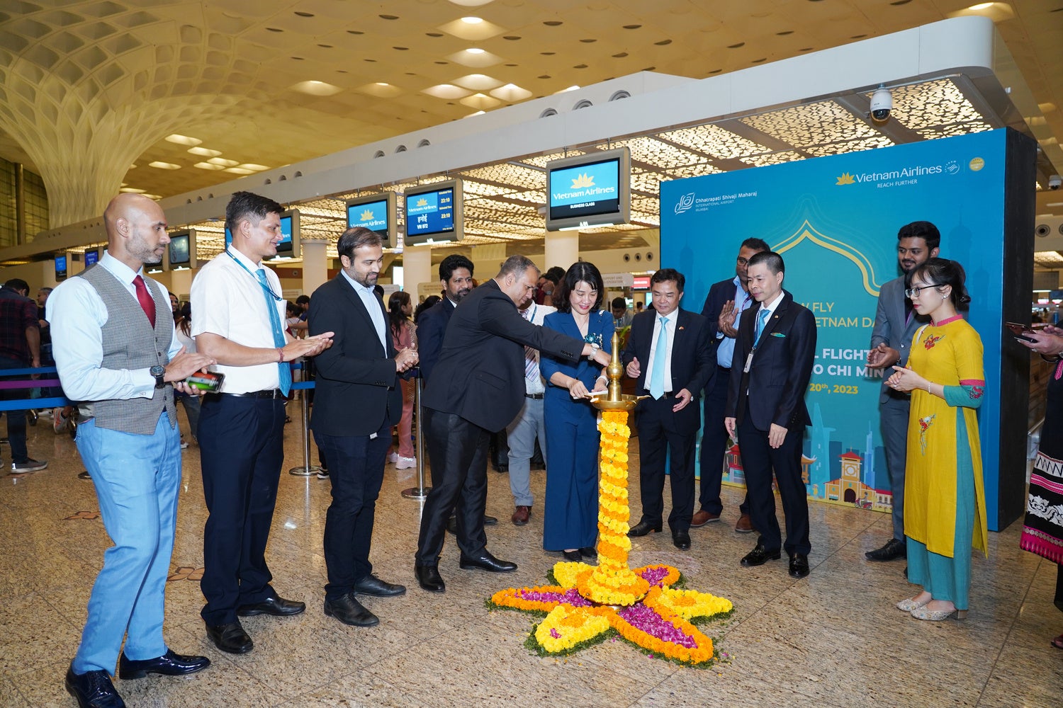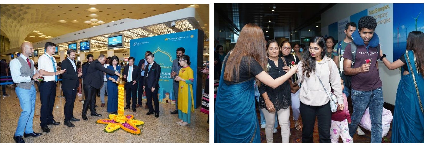 ムンバイでの就航記念式典には、ベトナム航空、在ムンバイベトナム総領事、空港の代表者が出席しました。また、乗客には花束と記念品が贈られ、乗務員らとの記念撮影が行われました。