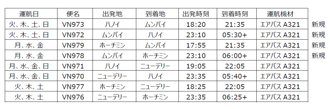 2023年5月20日、初便VN973便は190名の乗客を乗せてハノイ、ノイバイ空港を18時20分に出発し、同日21時22分(現地時間)にムンバイに到着しました。その後、VN972便は約200名の乗客を乗せ、ムンバイ、チャトラパティ・シヴァージー・マハラージ国際空港を23時10分(現地時間)に出発しました。機材はエアバスA321型機を使用しており、ベトナム航空によるインドへの就航都市として、ニューデリーに次いで2都市目となります。