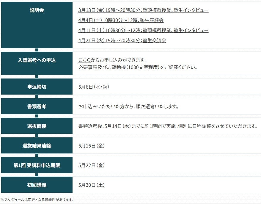 3月13日(金)、4月4日(土)、4月11日(土)、4月21日(火)に、説明会や塾生交流会を開催