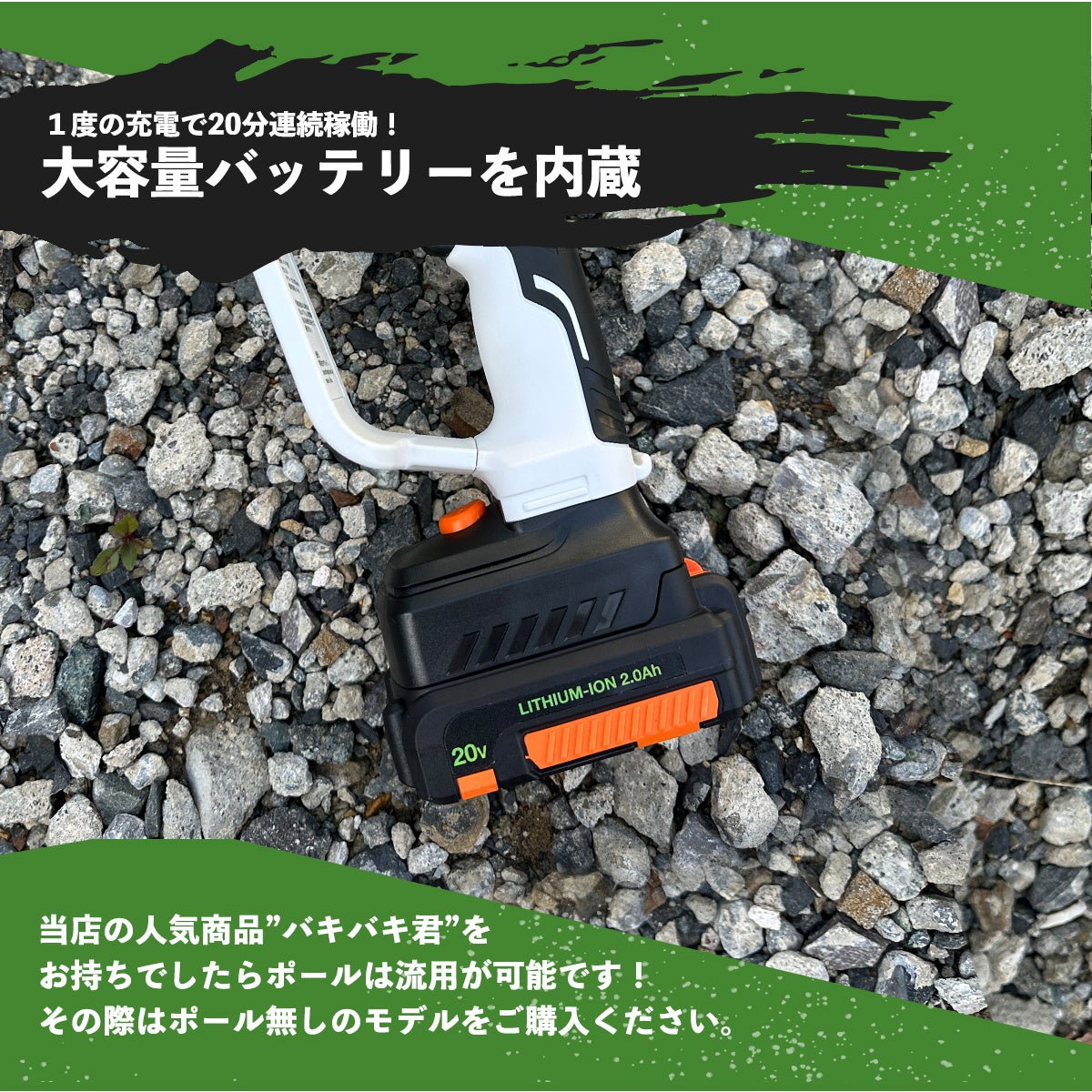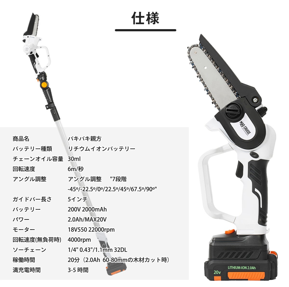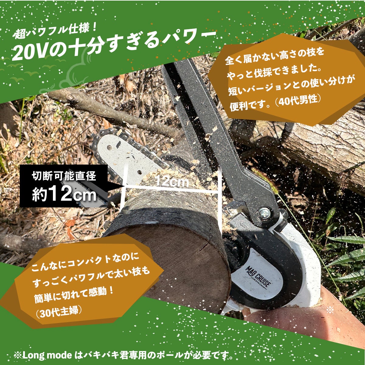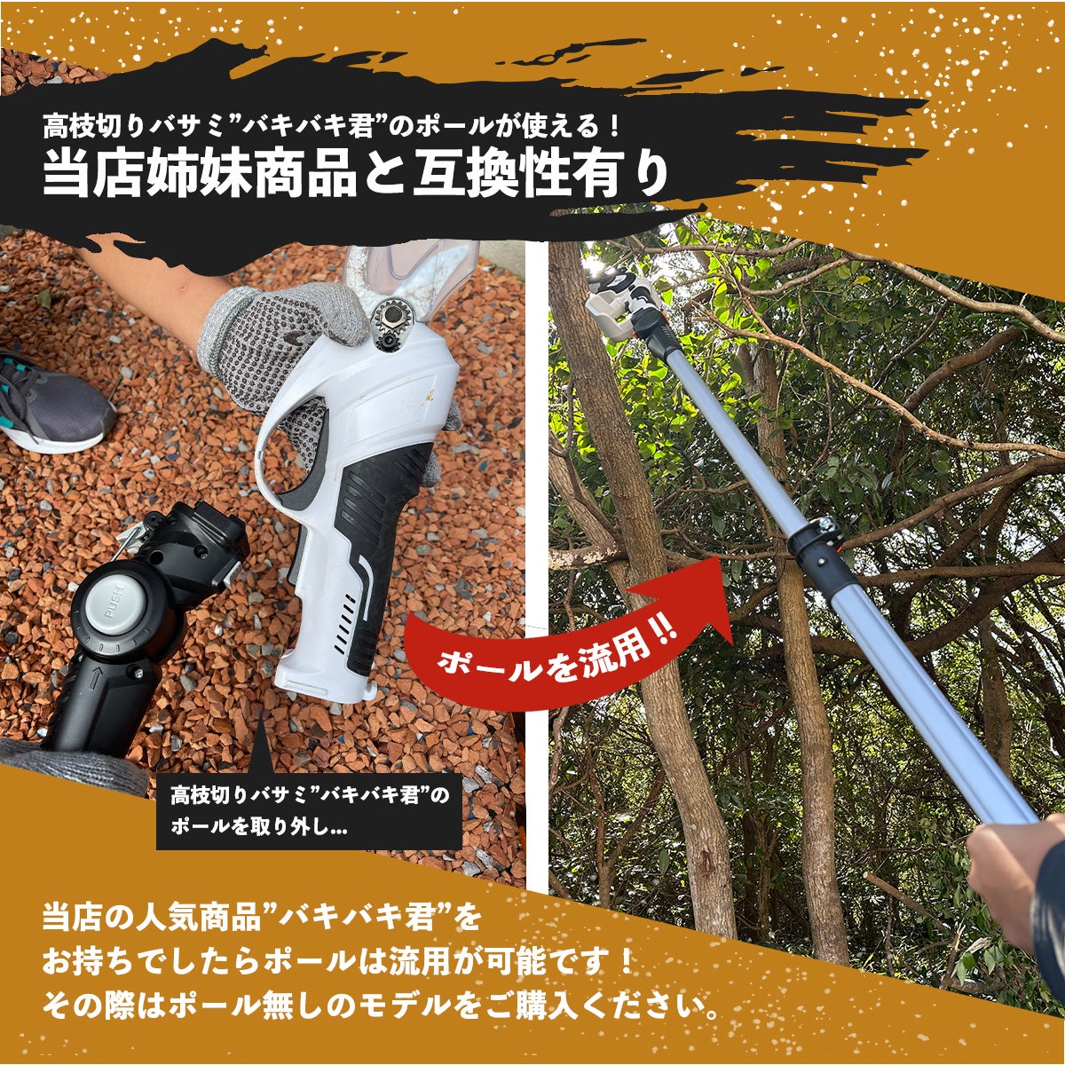 最長で2.2Mになる電動の高枝チェーンソーで、20Vのハイパワーで直径12cm程までスパッと切断します。また延長ポールを外してハンディタイプにもなるので、手元も高所の木々もマルチに切り落とす事が出来ます。弊社姉妹商品のバキバキ君(電動高枝切りバサミ)との互換性もあり、バキバキシリーズでお庭の困り事が一気に解決出来ます。