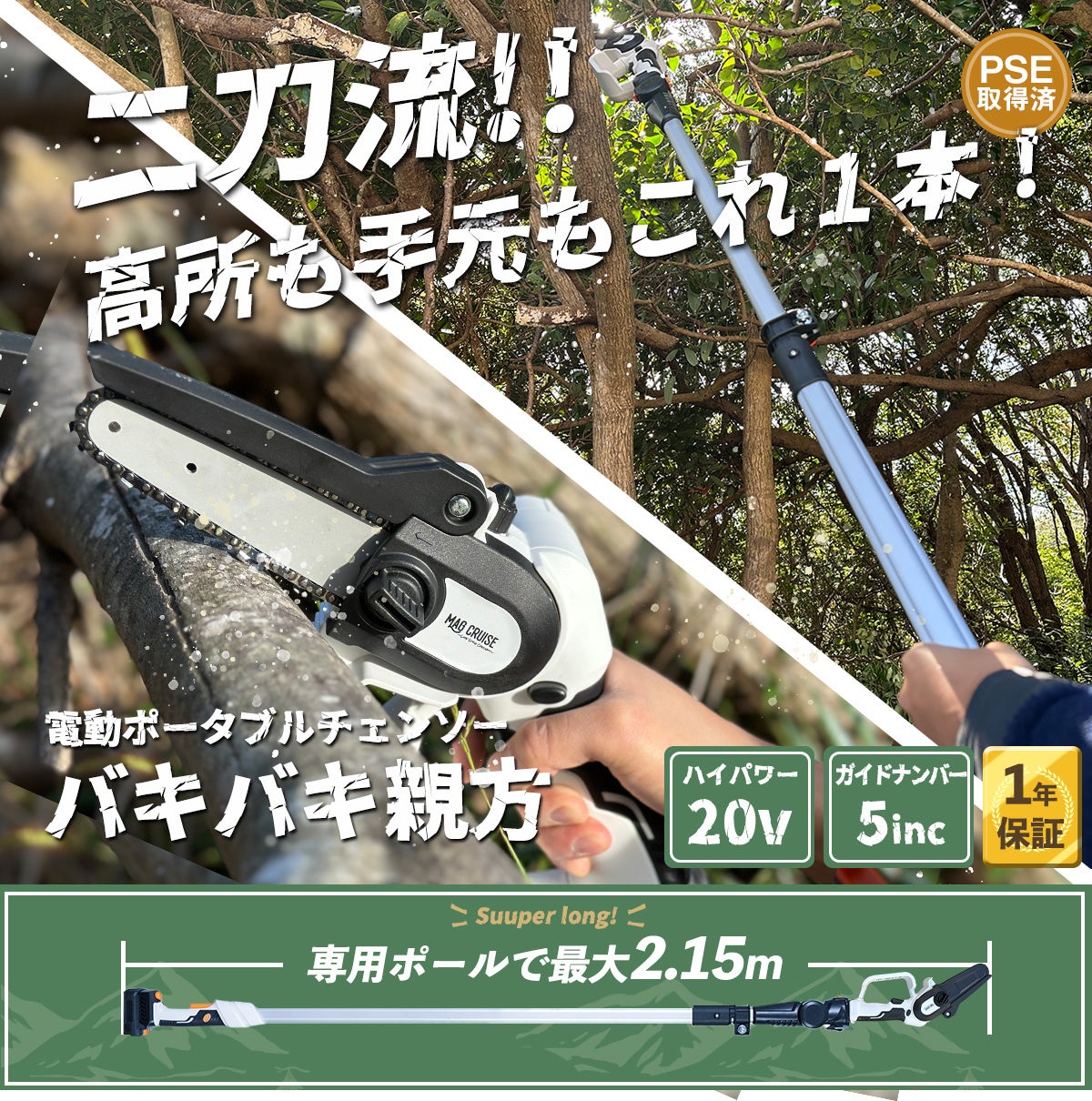 株式会社マグクルーズは、2022年1月10日に枝木の剪定やお手入れ用に大活躍の電動高枝チェーンソー バキバキ親方の販売を開始しました。バキバキ親方は、最長で2.2Mになる電動の高枝チェーンソーです。20Vのハイパワーで直径12cm程までスパッと切断します。また、延長ポールを外してハンディタイプにもなるので手元の木々も高所の木々もマルチに切り落とす事が出来ます。弊社姉妹商品のバキバキ君(電動高枝切りバサミ)との互換性もあり、バキバキシリーズでお庭の困り事が一気に解決出来ます。