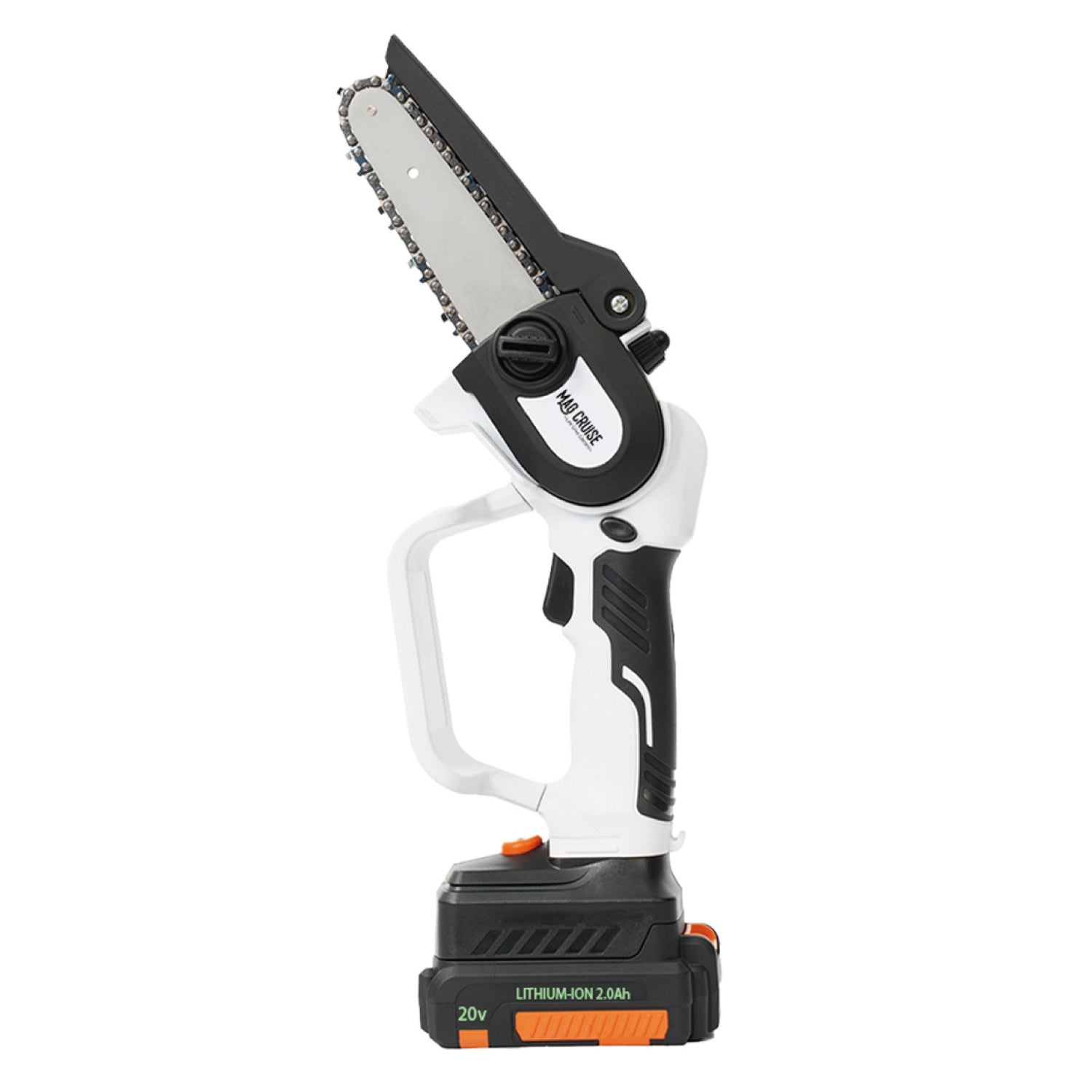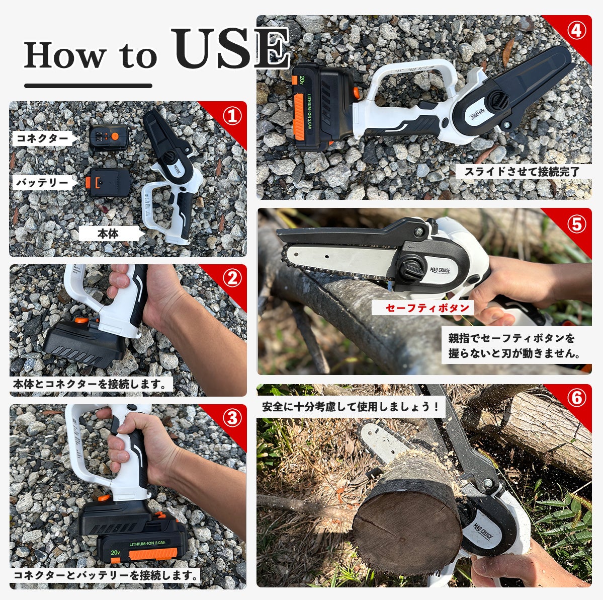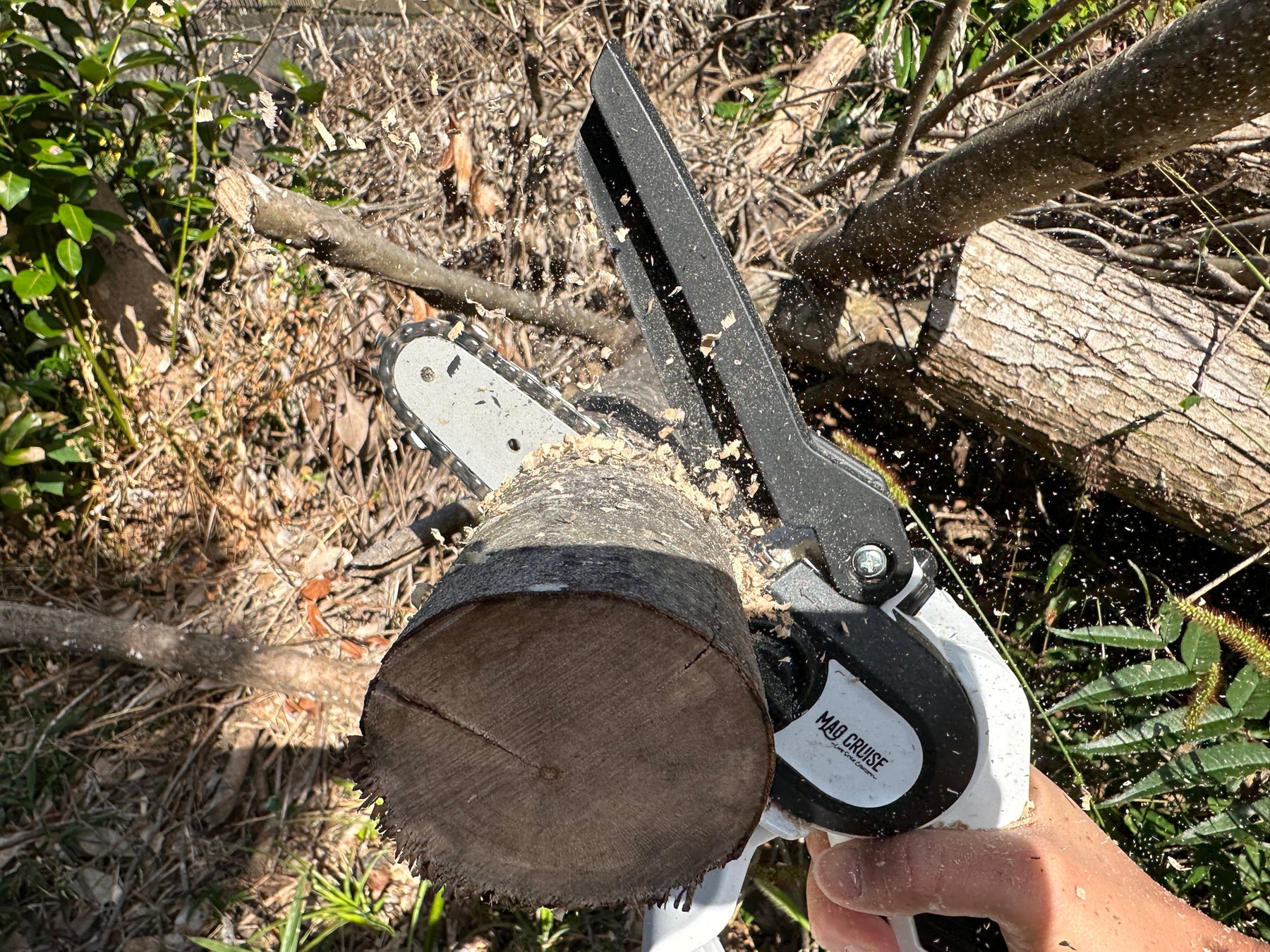 20Vの高出力で直径12cmの木までバキバキに切断できるので、ノコギリでは時間や力が必要な丸太や数が多い枝木も、自在にカットできます。