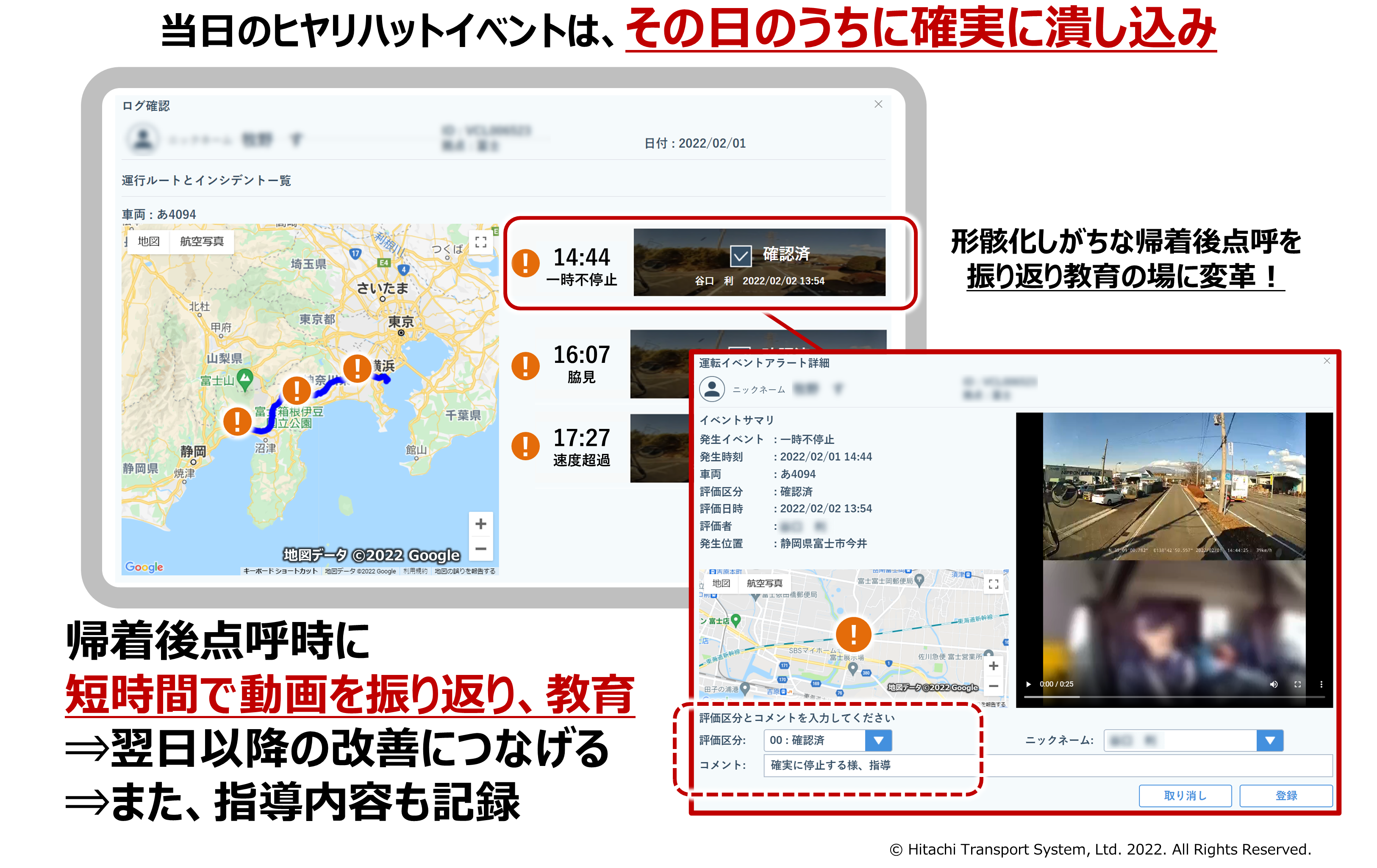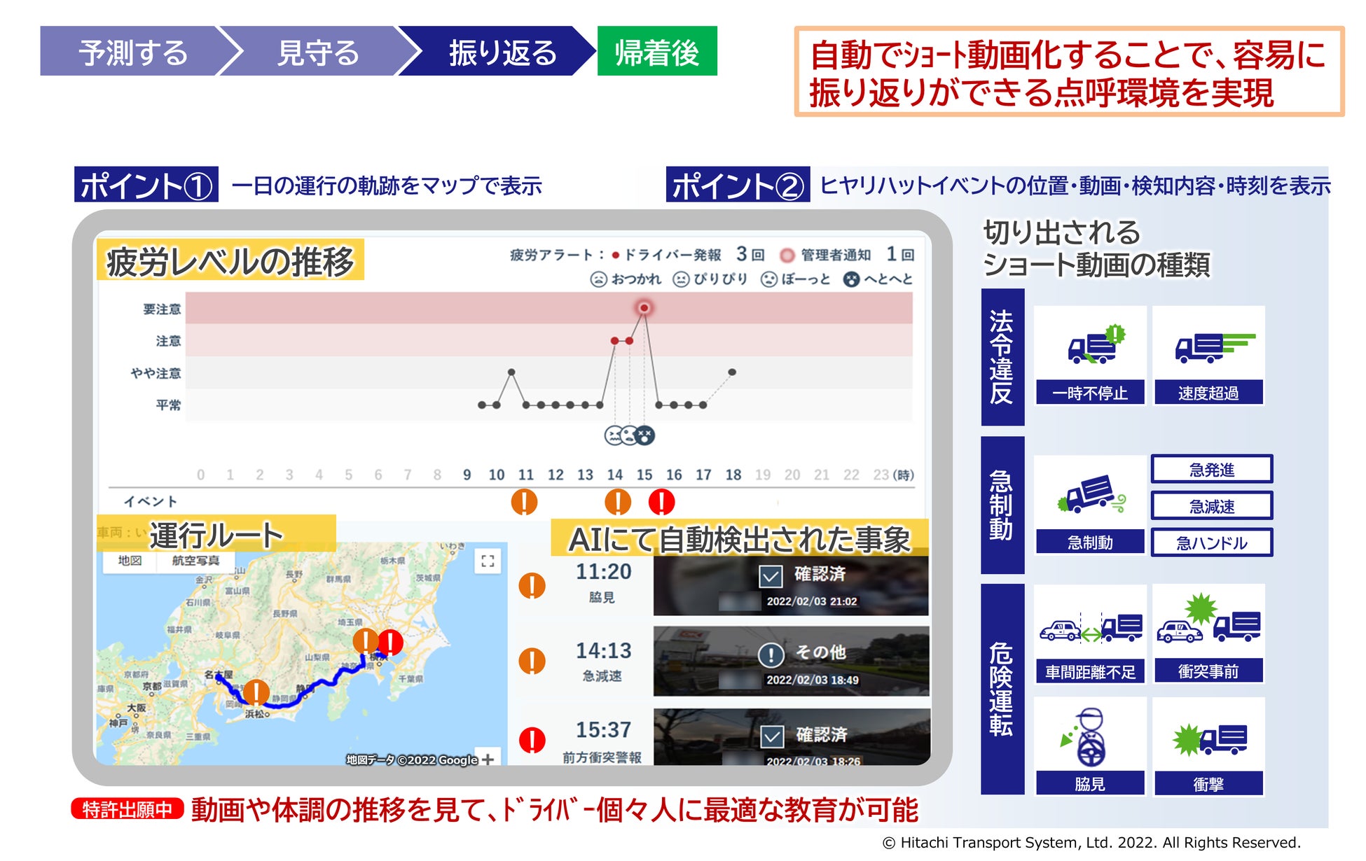 運行後は検知されたヒヤリハット動画を含む、運行当日の振り返りが短時間でできるよう的確な情報を提供します。https://www.hitachi-transportsystem.com/jp/sscv/safety/