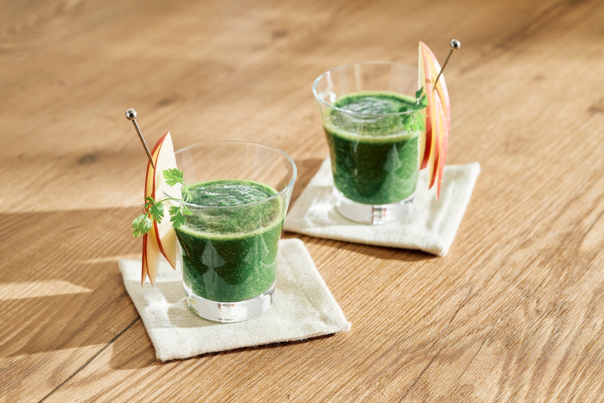 今回新たに発売するミキサーは、食材のなめらかな仕上がりを左右する粉砕力や切削力をアップデートし、6枚刃の強力チタンカッターを採用しました。短刃と波刃構造のチタンカッターとパワフルなモーターによる打ち上げ水流によって、角氷や冷凍果物などの硬い食材や、繊維質の多い葉物食材などをしっかり捉え均一にかき混ぜることで、食材のおいしさをそのまま活かしたなめらかなスムージーやポタージュに仕上げます。