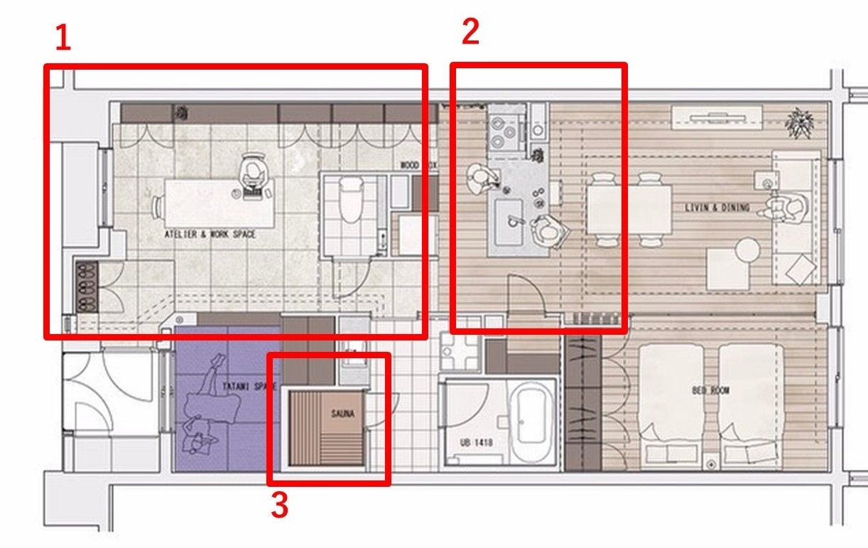 今回のモデルルームは「趣味を楽しむ大人の豊かな暮らし」をテーマに企画設計し、アトリエスペースやワークスペースを設けています。また、住宅設備機器事業の強みを活かし、多くの高級マンションに納品実績があるオリジナルブランド「INTENZA(インテンザ)」のキッチンを用いたオープンスタイルの調理スペースを設けています。また、商社として築き上げた仕入れルートを活かし、ホームサウナを設置しています。