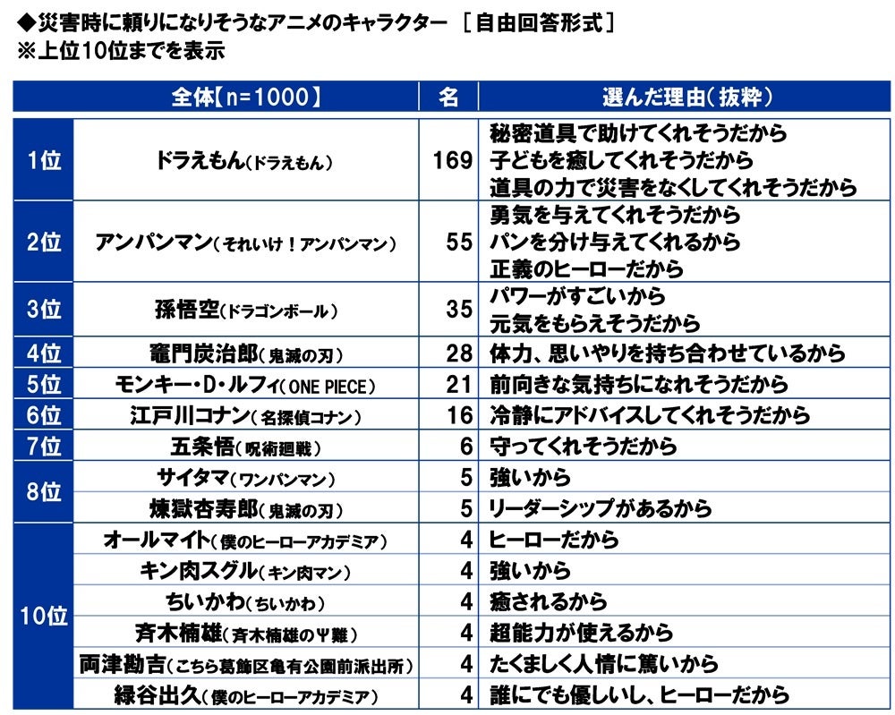 【災害時に頼りになりそうなアニメのキャラクター】では1位「ドラえもん(ドラえもん)」、2位「アンパンマン(それいけ!アンパンマン)」、3位「孫悟空(ドラゴンボール)」となりました。