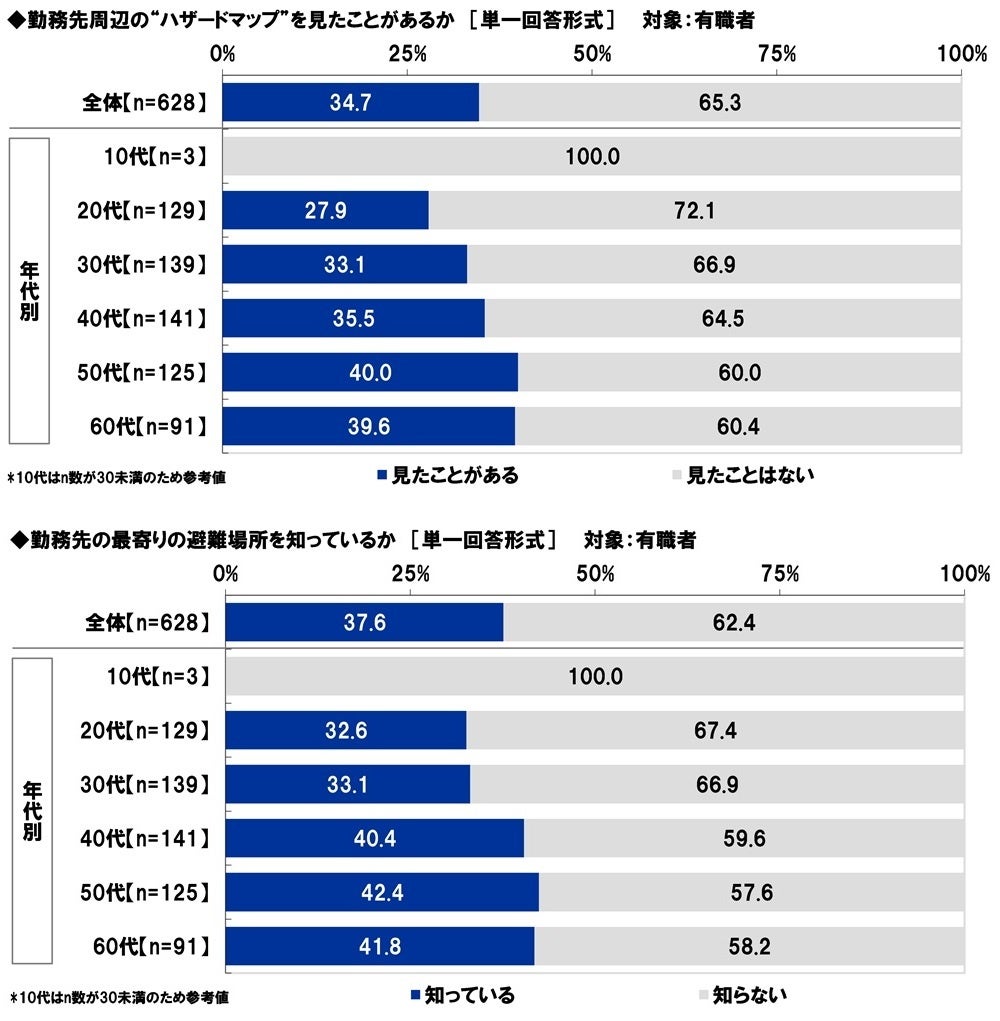 続いて、有職者(628名)に、勤務先周辺のハザードマップを見たことがあるか聞いたところ、「見たことがある」は34.7%、「見たことはない」は65.3%と、見たことがない人が多数となりました。
