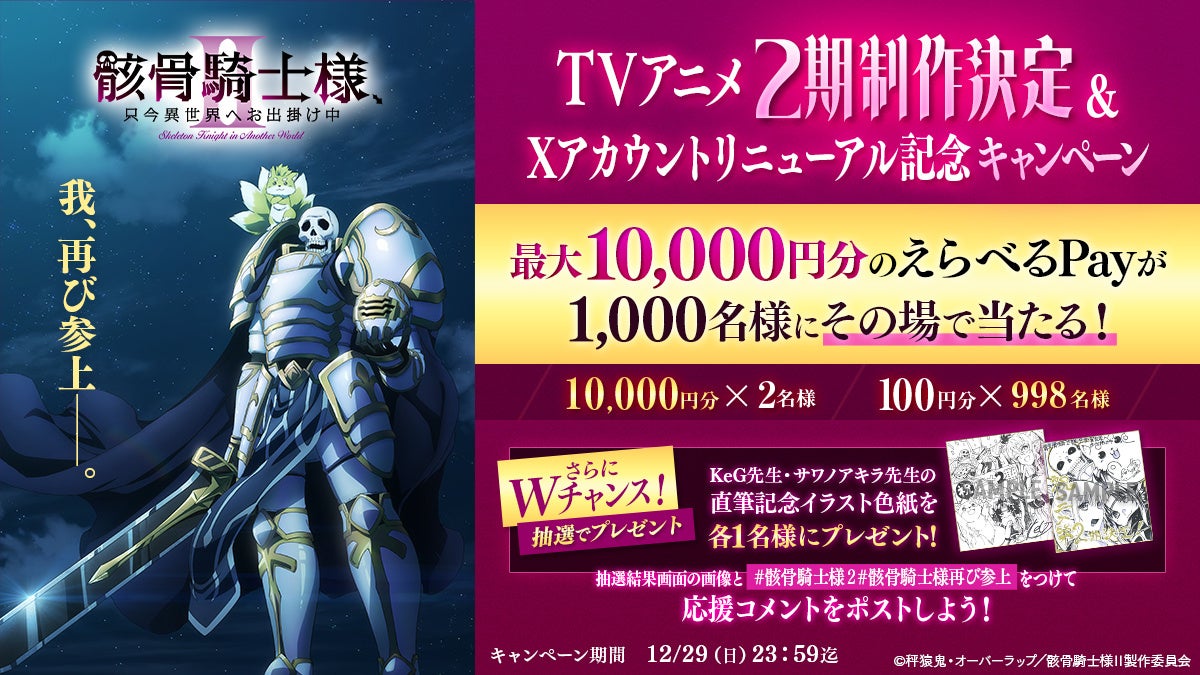 『骸骨騎士様、只今異世界へお出掛け中』のTVアニメ2期制作決定&Xアカウントリニューアルを記念したXキャンペーンを開催中!期間中にXアカウント@gaikotsukishi02をフォローし、該当ポストをリポストした方の中から抽選で1,000名様に最大1万円分の「えらべるpay」が当たる!さらにWチャンスで、原作イラスト・KeG、原作コミック・サワノアキラの直筆記念イラストが各1名様に当たるキャンペーンも実施中。早速アニメ公式X@ gaikotsukishi02をチェックしてキャンペーンに参加しよう!