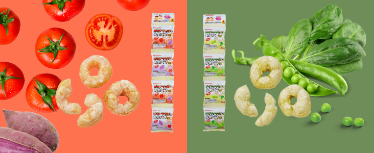アレルギー表示対象28品目不使用! 『あかいやさいのお米パフ小袋』『みどりのやさいのお米パフ小袋』6月10日(火)新発売!