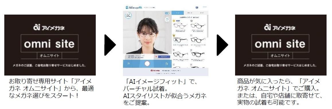 これからのメガネ選びは、店舗に行かなくても思い立った時にバーチャルな世界でフレーム選びが可能です。また、AIスタイリストがお客様一人ひとりに似合うメガネを提案いたします。気に入ったメガネが見つかったら、Web上でご購入いただくか、自宅やお近くの店舗に取り寄せして実際に試着・購入することも可能です。