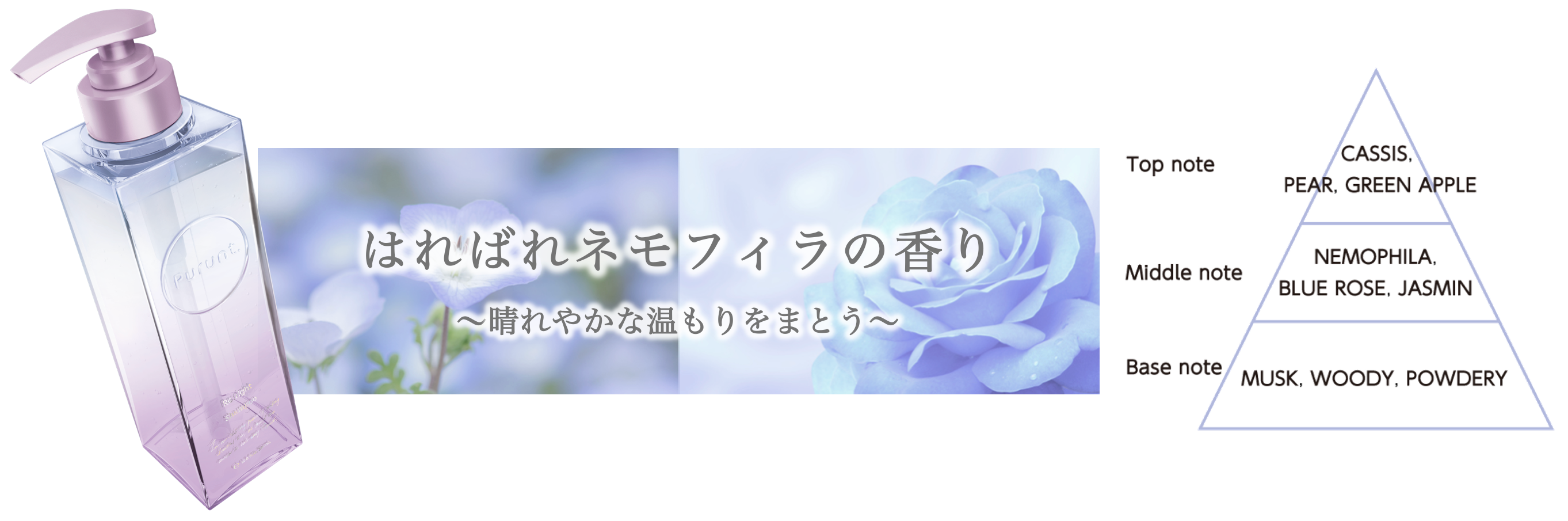 晴れやかなネモフィラとブルーローズに、朝摘みフルーツを重ねた明るさのある香り。