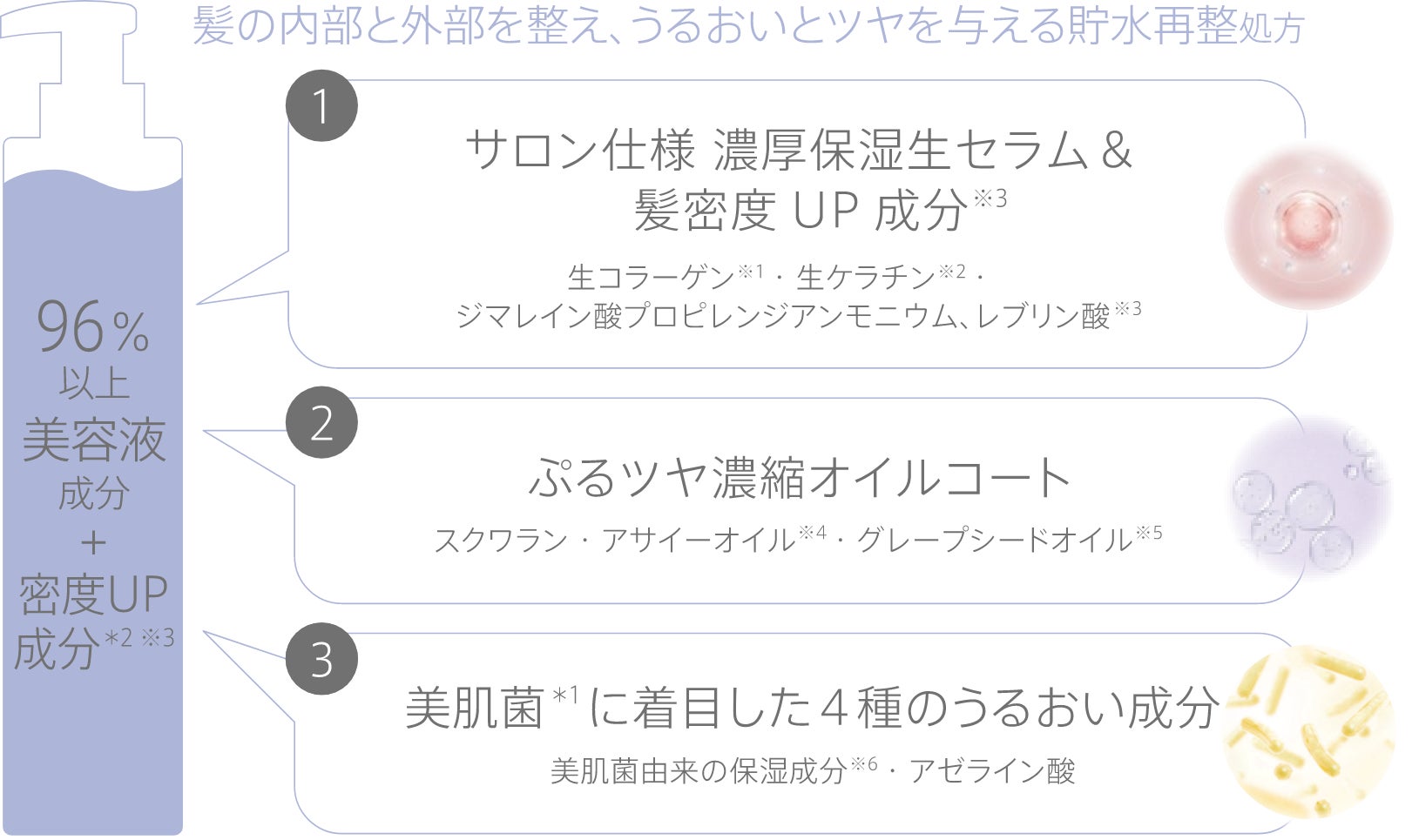 *1 肌に本来存在している菌のこと *2 基剤を除く、水を含む(シャンプー)/水を含む(ヘアトリートメント・ヘアミルク) ※1 水溶性コラーゲン(保湿) ※2 ケラチン(羊毛)(補修) ※3 ジマレイン酸プロピレンジアンモニウム、レブリン酸(全て補修) ※4 アサイヤシ果実油(保湿) ※5 ブドウ種子油(保湿) ※6 ビフィズス菌培養溶解質、酵母エキス、エンテロコッカスフェカリス(全て保湿) ※7 セラミドAP、セラミドNP(全て保湿) ※8 γードコサラクトン(補修)