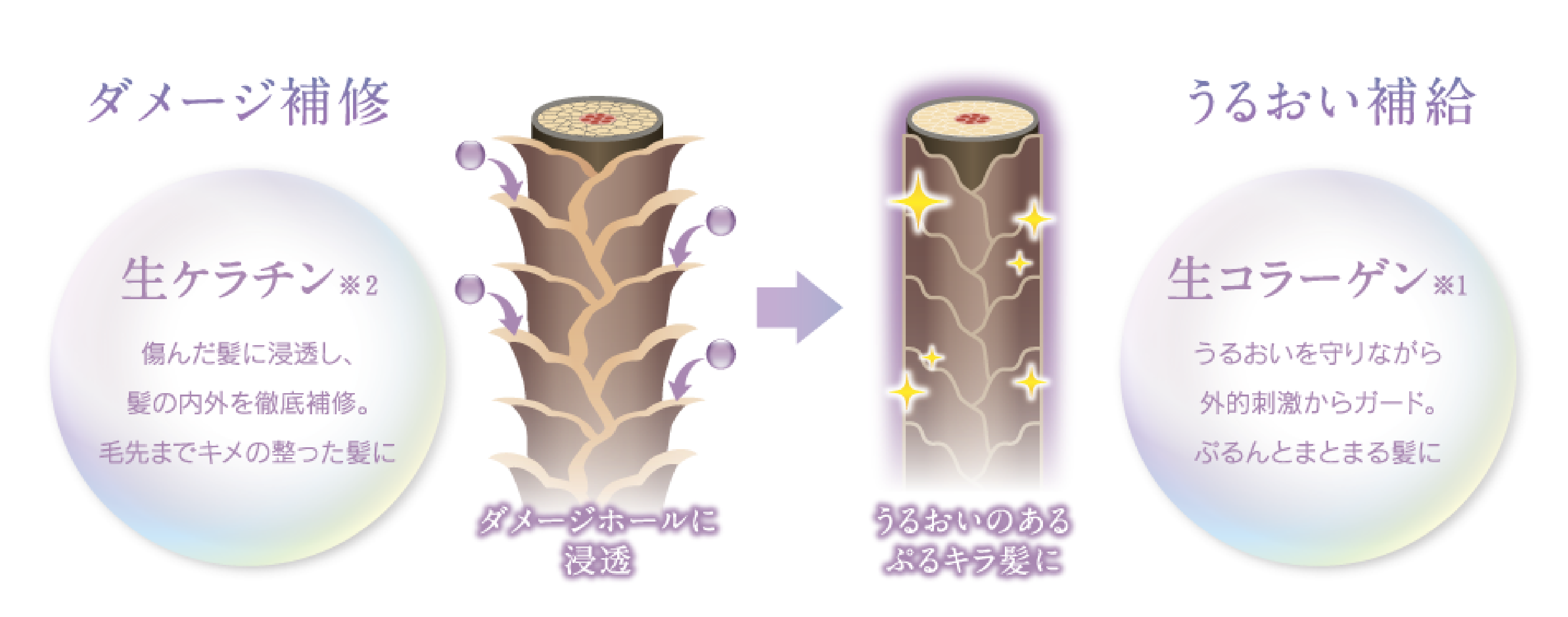 髪の内部を整え、うるおいを保持する「生コラーゲン※1」&「生ケラチン※2」に着目。