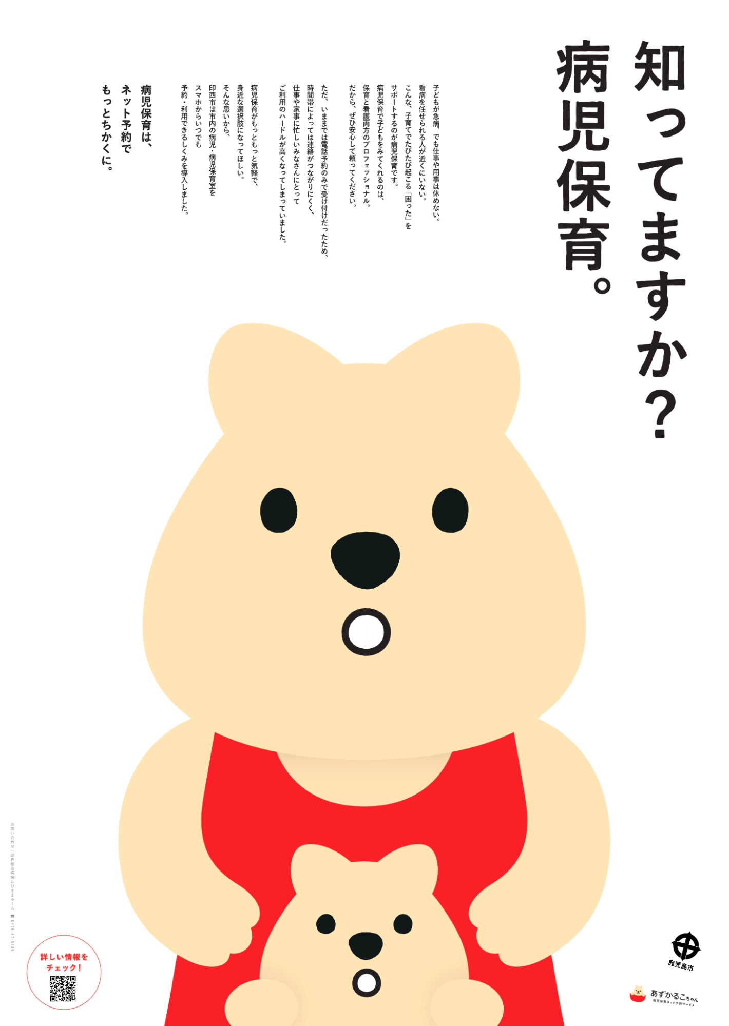 また、本取り組みと病児保育事業自体の周知強化を目的としたパンフレットやポスターを制作し、鹿児島市市内の保育園等で配布、掲示を行います。病児保育の利用、運営、啓蒙にあずかるこちゃんが力になれるよう、今後もサービス提供を推進していきます。