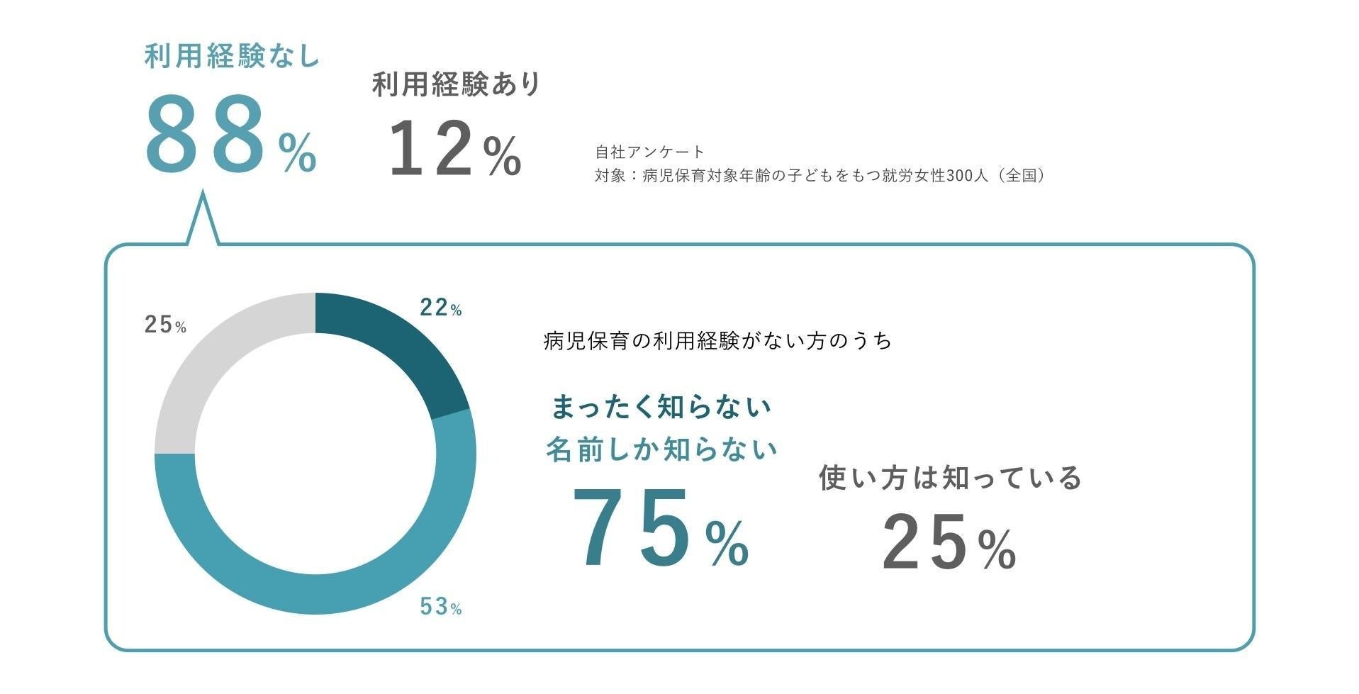 弊社が全国の子どもを持つ就労女性300人にアンケートを行ったところ、「病児保育の利用経験がない」と答えた方は88%にのぼりました。さらに病児保育を利用したことがない方に、病児保育について知っているか聞くと、75%が「知らない」もしくは「名前しか知らない」と回答しました。また、アンケート結果から、手続きの煩雑さが利用を遠ざけているということも分かりました。