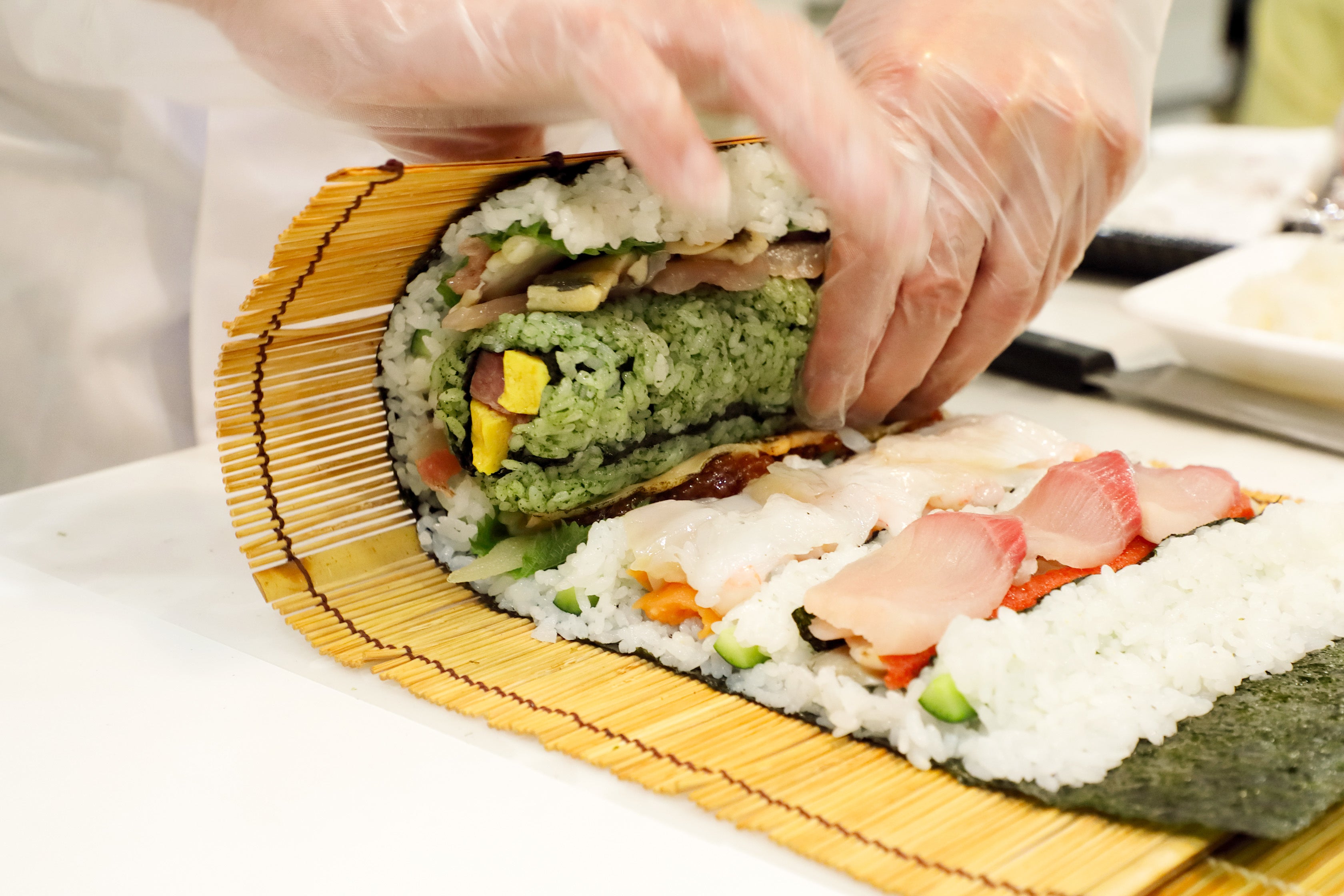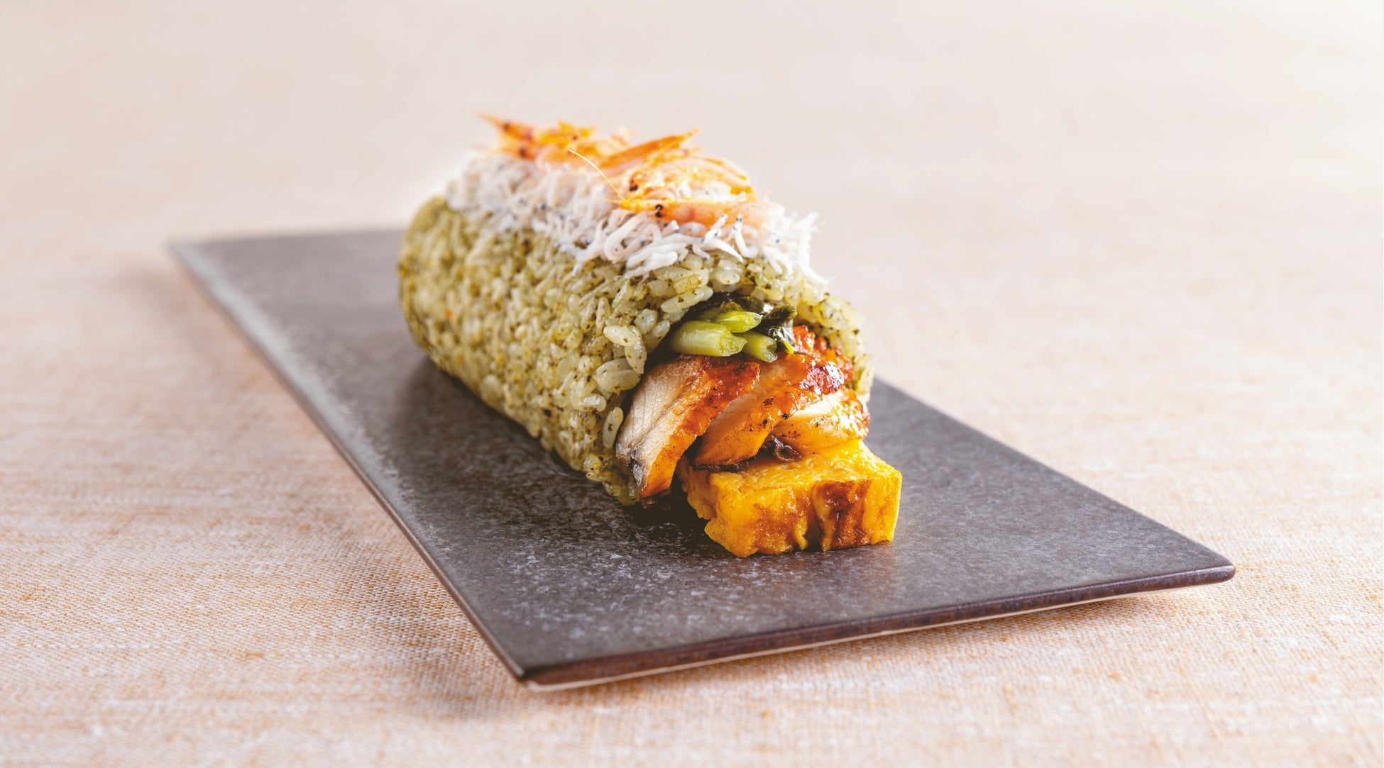 今回は冷凍ではなく生にこだわり、のどぐろを炙って巻いてみました。の どぐろは山口産を使用しているのですが、エビを入れたり、ナスを南蛮漬 けにしたものを入れ、食べていて口の中が楽しくなるような仕上げにして おります。炙っているので香ばしさもあり、いろいろな食感や味を楽しみ ながら食べ進んでいくような商品になっています。
