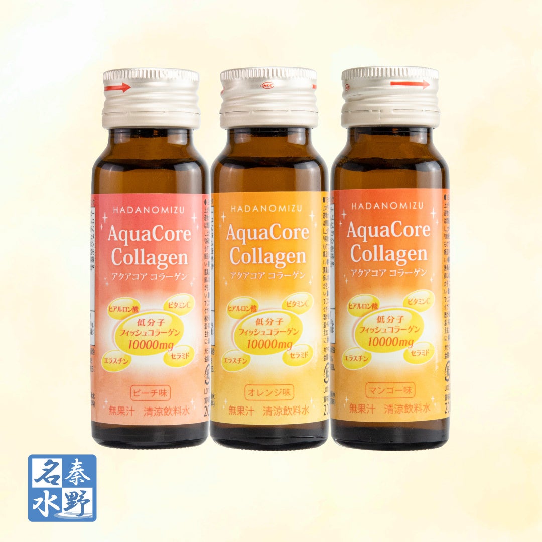 商品名:「HADANOMIZU AquaCore Collagen (アクアコア コラーゲン) ドリンク(10本入)」ピーチ味、「HADANOMIZU AquaCore Collagen (アクアコア コラーゲン) ドリンク(10本入)」オレンジ味、「HADANOMIZU AquaCore Collagen (アクアコア コラーゲン) ドリンク(10本入)」マンゴー味
