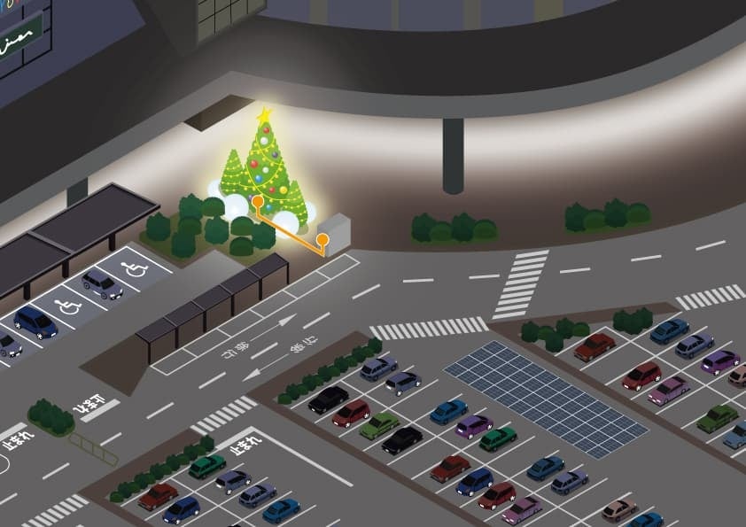 ミライラボが開発したSolar MobiwayとEVリパーパス蓄電池※1を組み合わせた自律型エネルギーインフラ 「AIR」 をイオンモール日の出の駐車場内に設置いたしました。日中、Solar Mobiwayで発電した電力をEVリパーパス蓄電池に蓄電し、その電力を用いて、夜間に植栽のイルミネーションの点灯を行います。