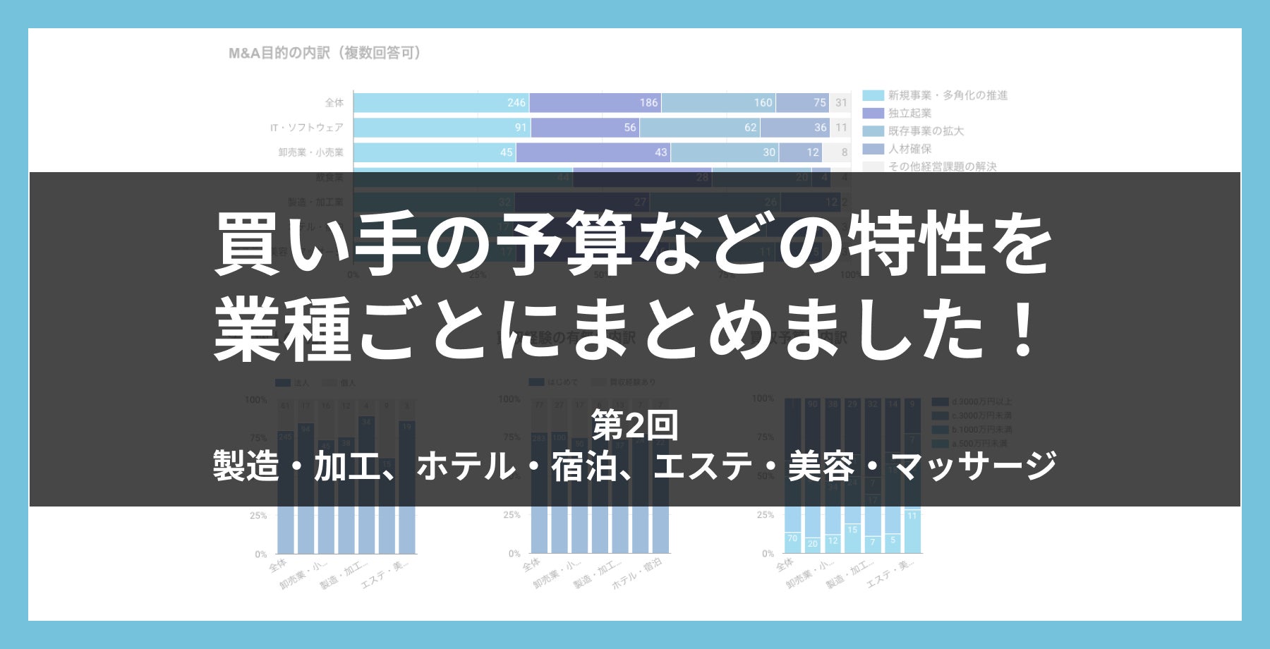 第2回として『製造・加工』『ホテル・宿泊』『エステ・美容・マッサージ』の3業種の買収を希望をする買い手の特性について分析いたしました。