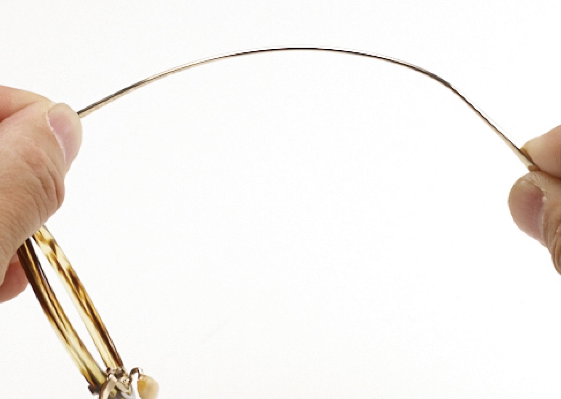 テンプル(つる)は、純チタンの丸線の状態から、たたいて延ばす『スウェージング工法』で作られています。金属密度が高められることで強度と柔軟性が備わり、メガネをかけたときのホールド感が上がります。