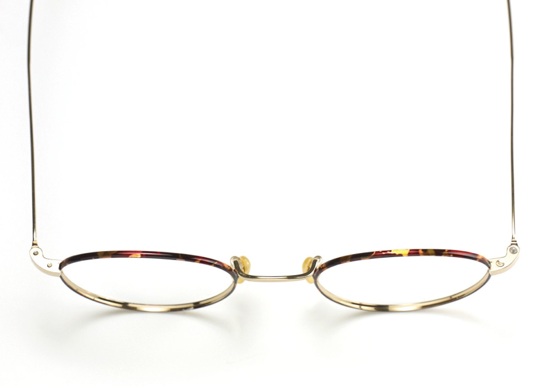 オーバルに近いボストン型のオールメタルフレーム。小さめサイズで、女性には可愛く、男性にはクラシカルにかけていただけます。ゴールドをベースに、正面にだけ七宝を施して、すっきりした印象に仕上げました。(レンズ横幅:45)