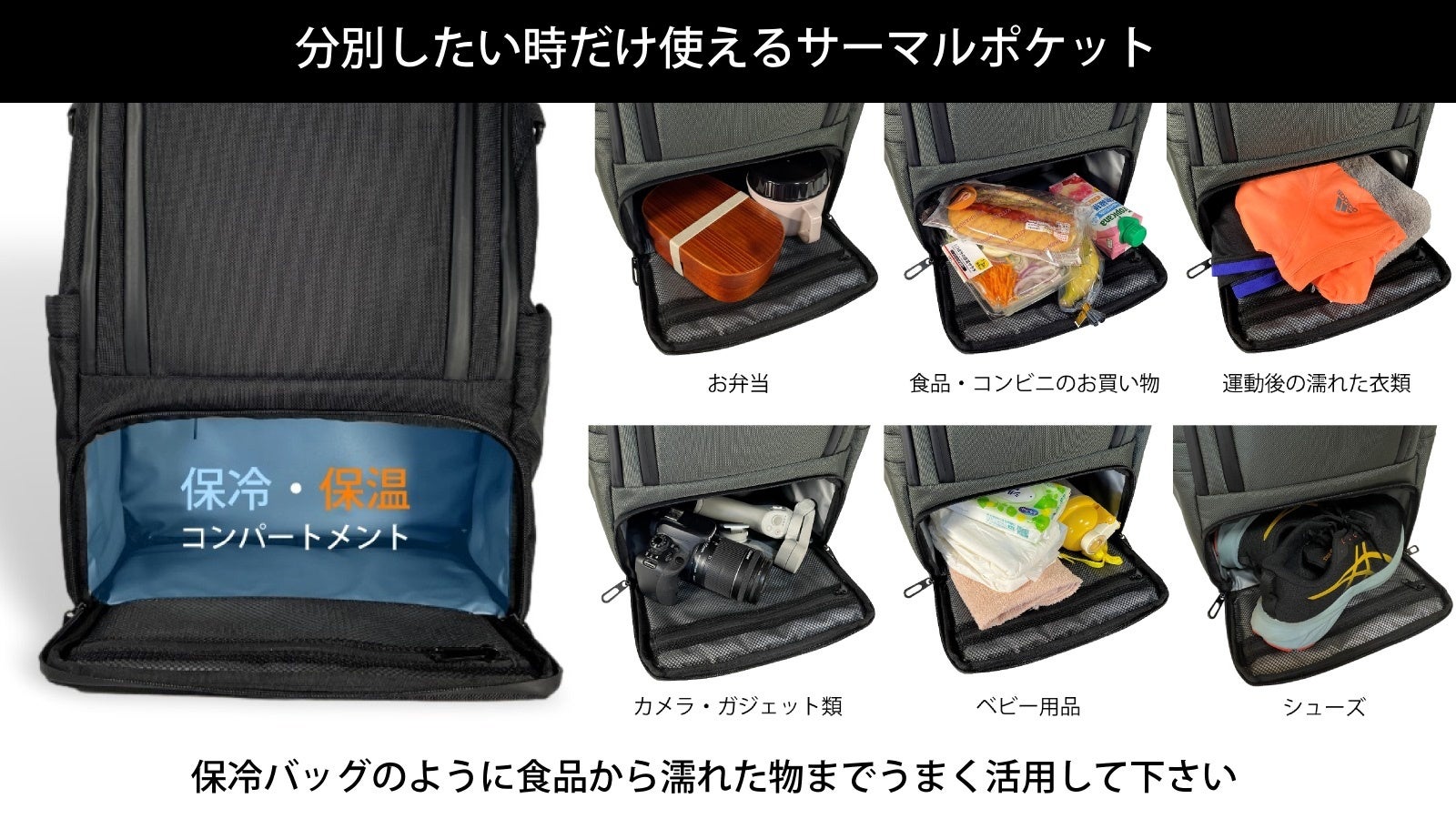 荷物を分けたい時だけ使える!保冷保温機能を完備し、お弁当はもちろん濡れた物も簡単に分別収納。