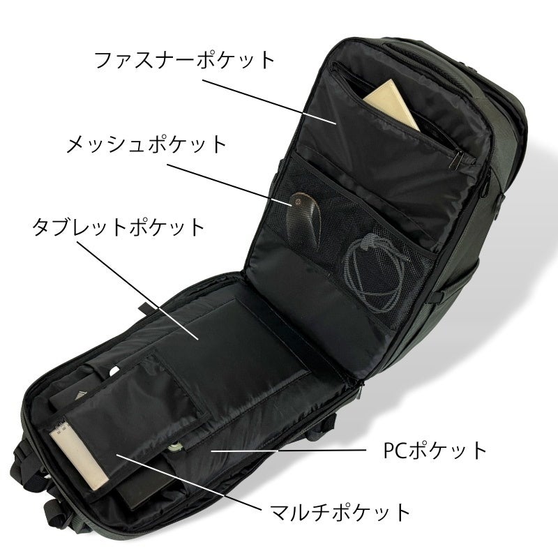 整理しやすい4層の収納スペースに25個のポケットを完備。高強度な1680d素材で新機能も搭載!