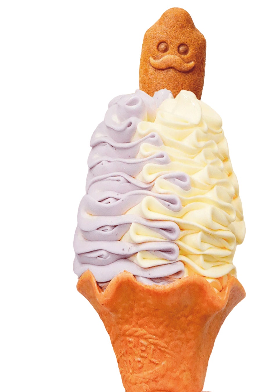 やきいもの妖精「焼き右衛門(やきえもん)」型のおいもカステラがのった、安納芋×紫芋の華やか&濃厚なおいもソフトクリーム。まるではなびらのようなソフトクリームです。