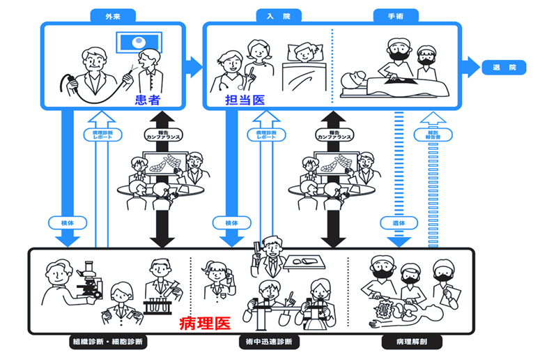病理医とは、ミクロ(顕微鏡)レベルで疾患の診断を行う医師のことで,現在の医療の中で,特にがんなどの腫瘍性病変の場合は,この「病理診断」が最終診断と位置付けられています(参照:診療の流れ図)。ところが,近年のがん患者の増加もあり,この病理医の不足が全国的に深刻化しています。全国の約8,800病院中,常勤病理医が在籍する病院は5.7%,その内約35%は一人の病理医しか在籍していない状況です。病理医不足による病理診断の遅れは,患者の治療の遅れにもつながり,また現場の病理医は日常業務に追われて疲弊し,個々の病理医の専門性も高められず,診断の難しい症例への対応も難しく,場合によっては誤診につながるという悪循環に陥りかねません。