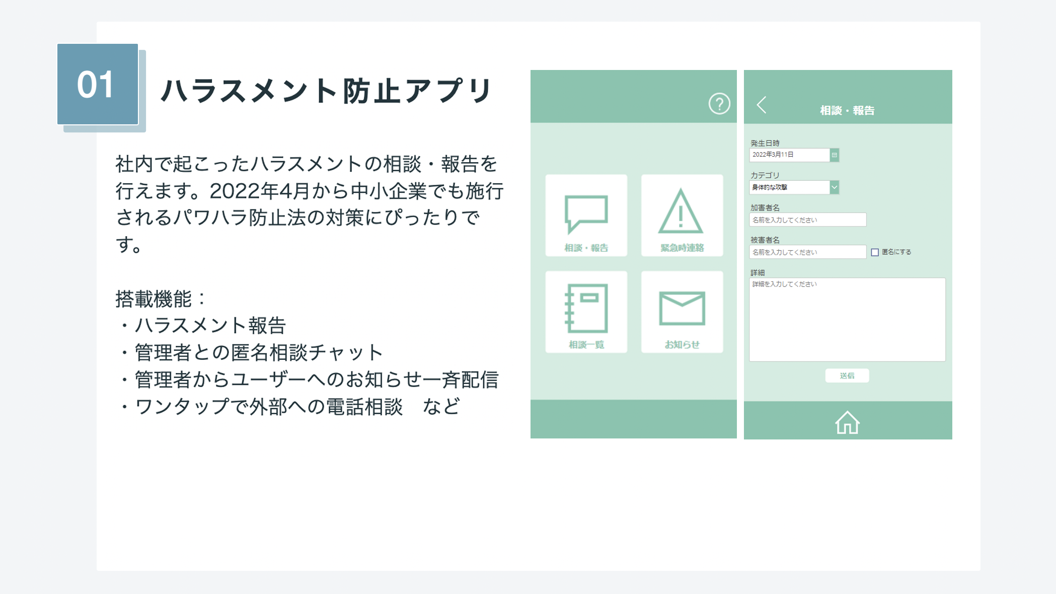 社内で起こったハラスメントの相談・報告を匿名で行うことができます。2022年4月から中小企業でも施行されるパワハラ防止法の対策にぴったりです。