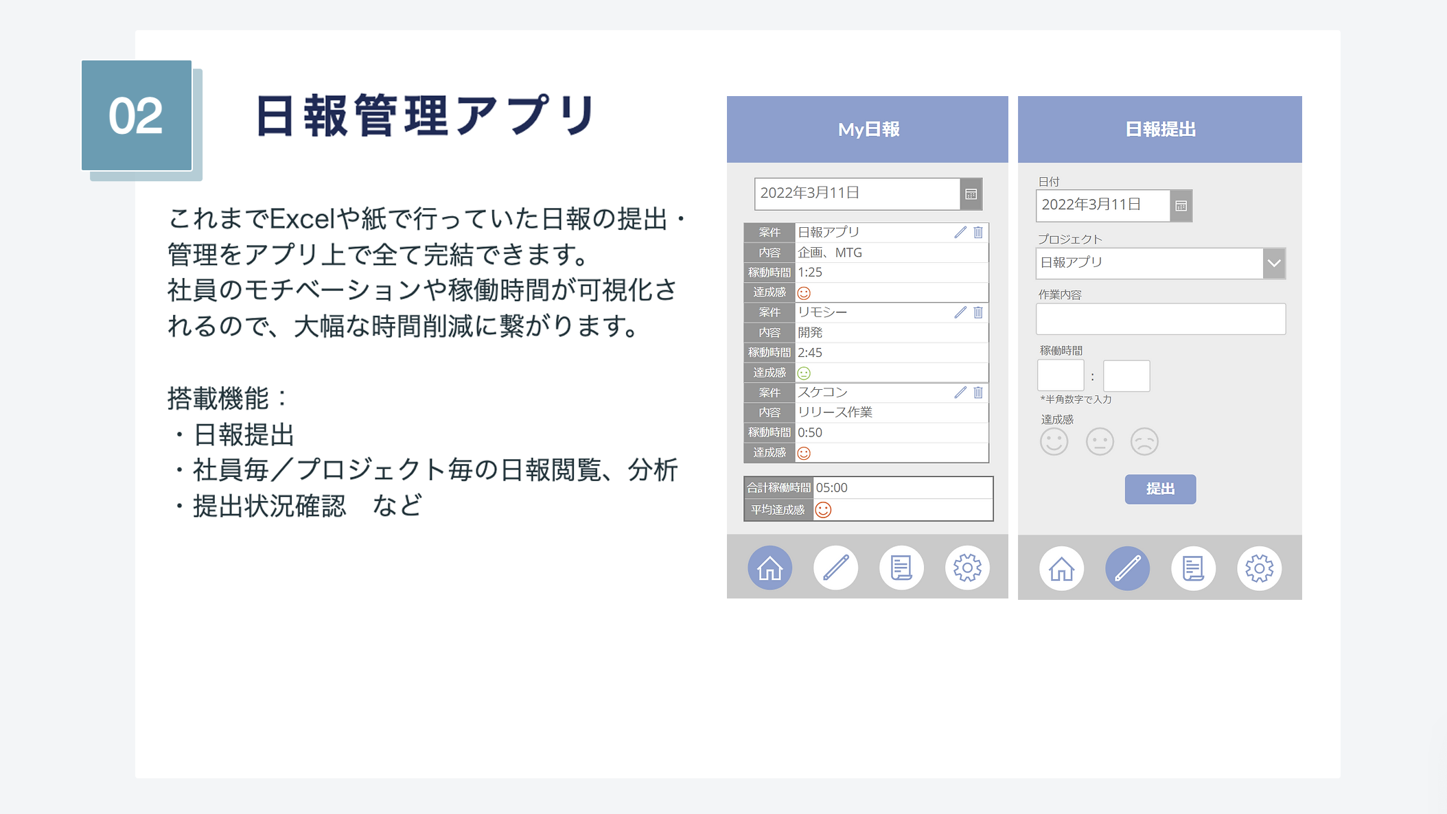 これまでExcelや紙で行っていた日報の提出・管理をアプリ上で全て完結できます。