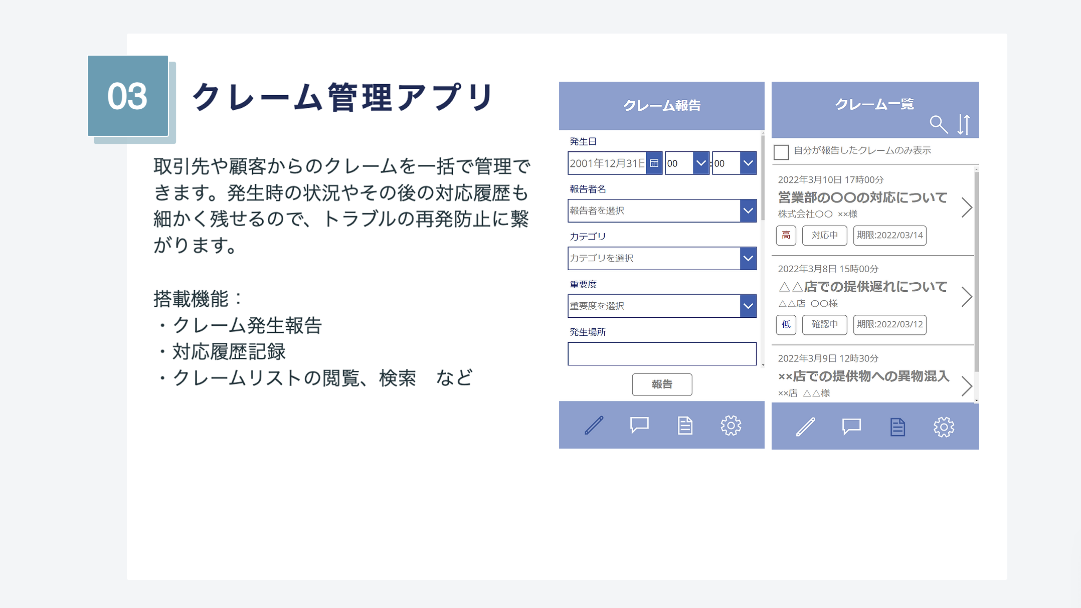 取引先や顧客からのクレームを一括で管理できます。発生時の状況やその後の対応履歴も細かく残せるので、トラブルの再発防止に繋がります。