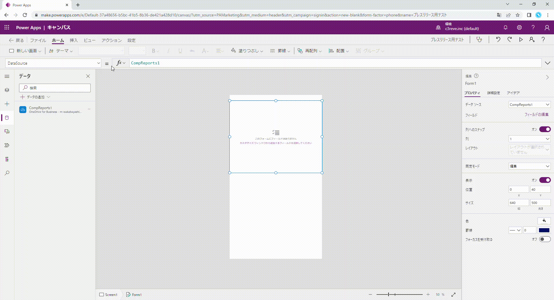 下記は、「Power Appsにて新規データを追加するためのフォーム作成の様子」です。