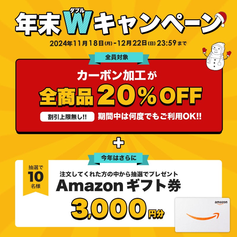 ニワカソフト株式会社(所在地:福岡県福岡市中央区、代表取締役:古賀 聡、http://niwakasoft.jp)が運営するカーボン加工サービス『カーボンラボ.jp』は、お客様に感謝の意を込めて、11月18日(月)より全商品20%OFFになる年末Wキャンペーンを開催します。さらに今年はキャンペーン期間中にご注文いただいたお客様の中から、抽選で10名様に3,000円分Amazonギフト券プレゼント。