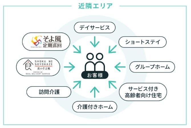 また、住み慣れた地域で安心して暮らし続けていただくために、「そよ風」地域包括ケアの拡充を進めています。近隣エリアのサービス連携により、お身体の状態にあわせたスムーズなサービス移行をすることが可能です。