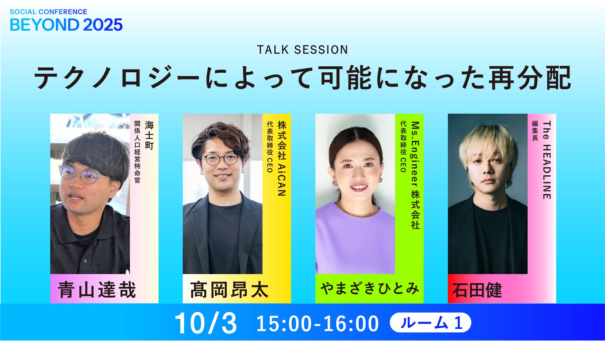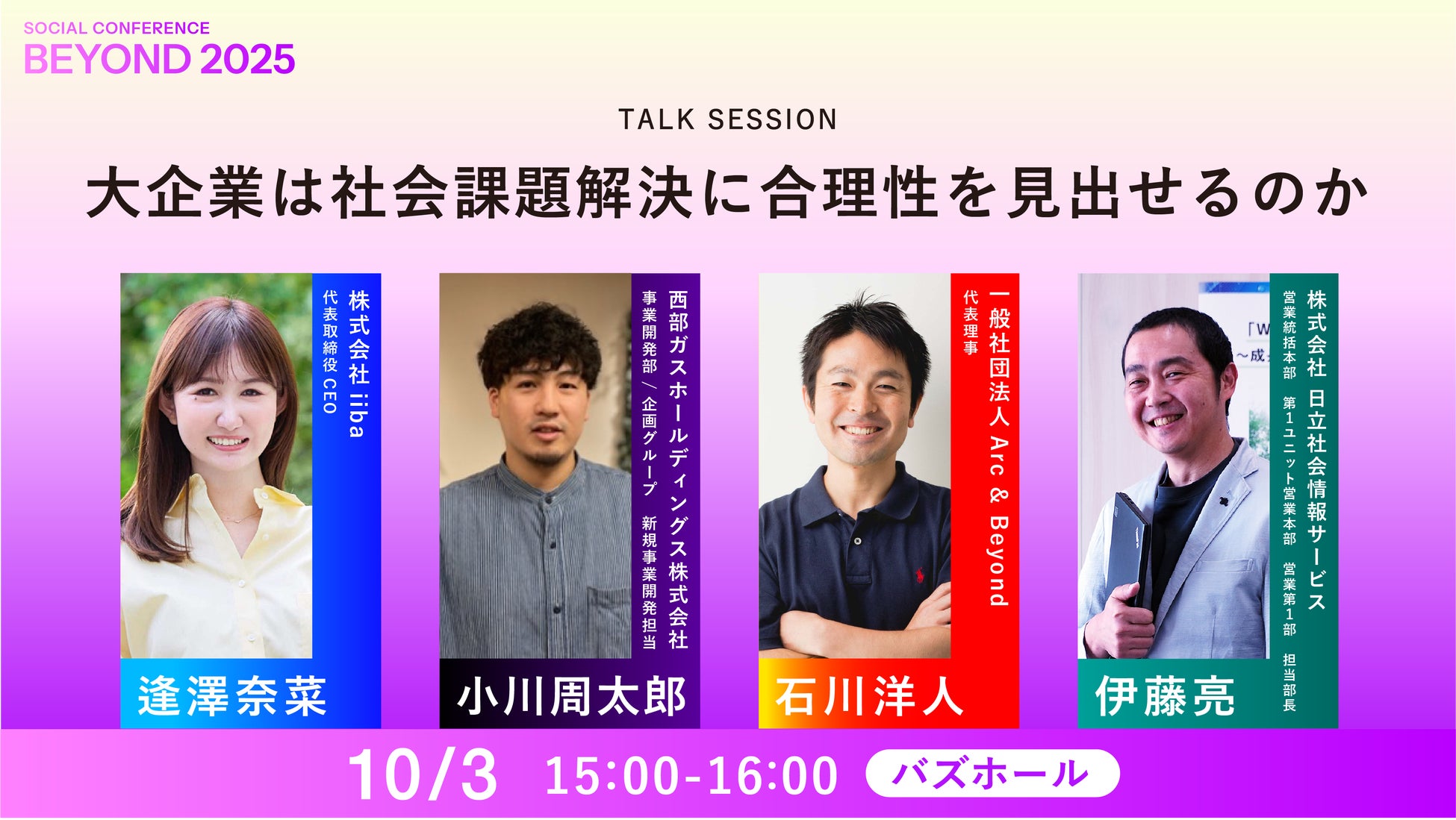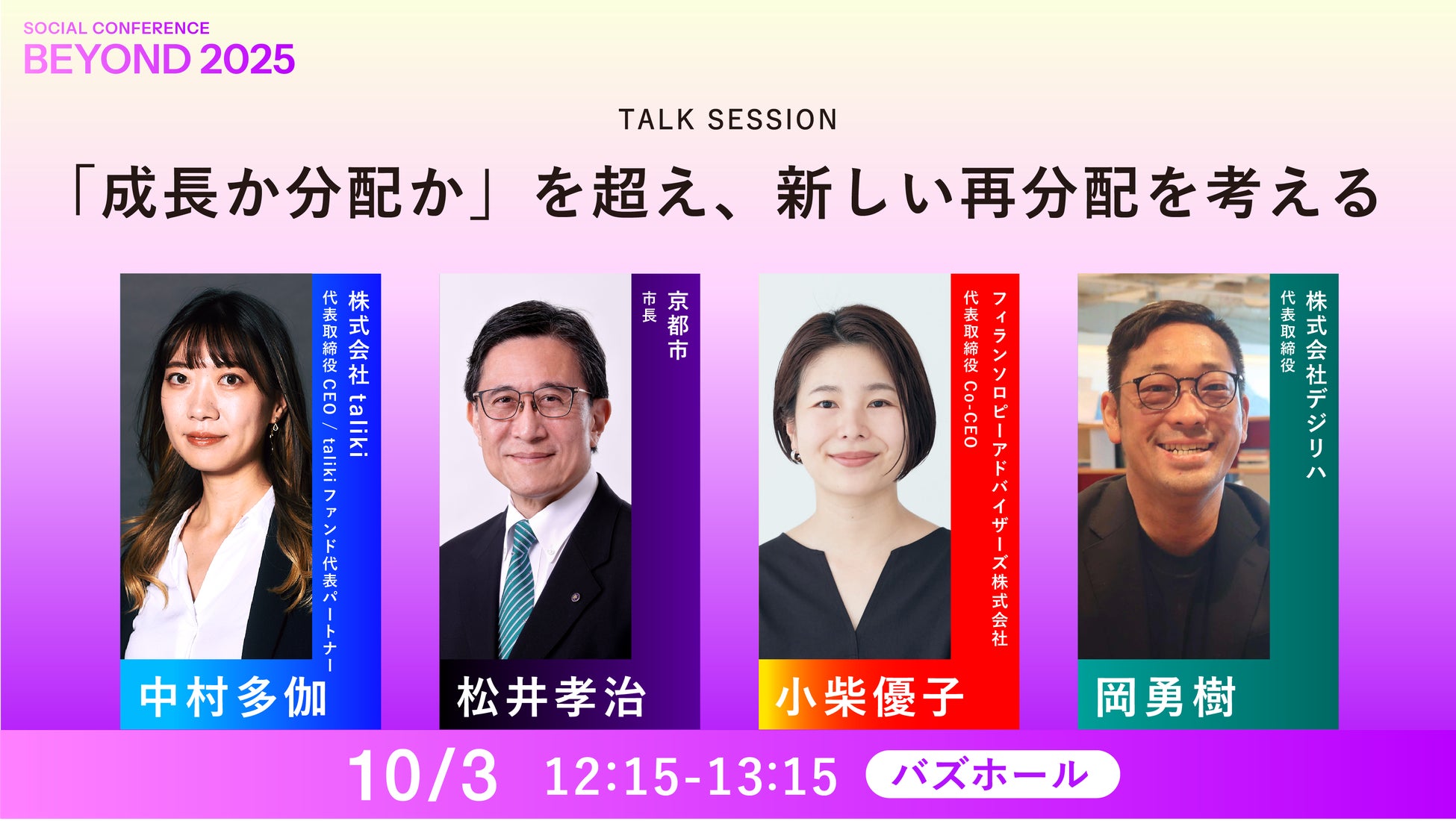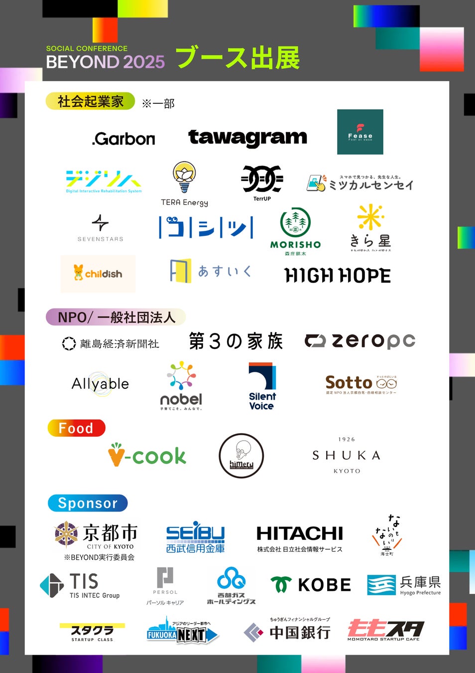 社会課題解決のプレイヤー支援を行う株式会社taliki(本社:京都府京都市、代表取締役:中村多伽、以下taliki) は、10/3・10/4開催のソーシャルカンファレンス「BEYOND2025」に向け、総勢31名のゲスト、計7つのトークセッション/2つのワークショップ、合計40近いブース出展者、20社/自治体のスポンサーの詳細を公開いたしました。