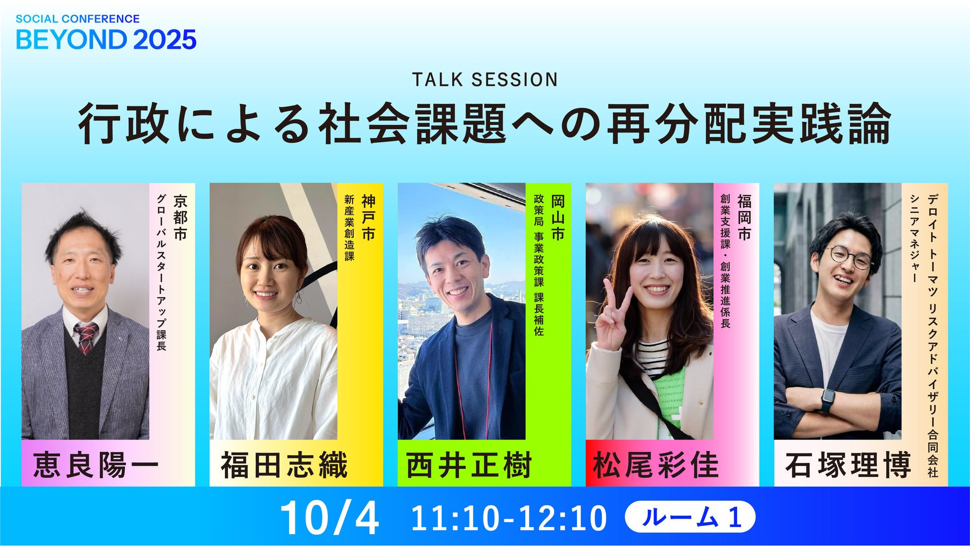 再分配の最たる担い手である「行政」。彼らが今、どのようなリソース配置を描き、いかなる長期的な課題解決を目論んでいるのか。社会のOSを設計する行政の、普段はなかなか見えない戦略や思想に触れ、官民連携の新たな可能性を探るためのセッションです。