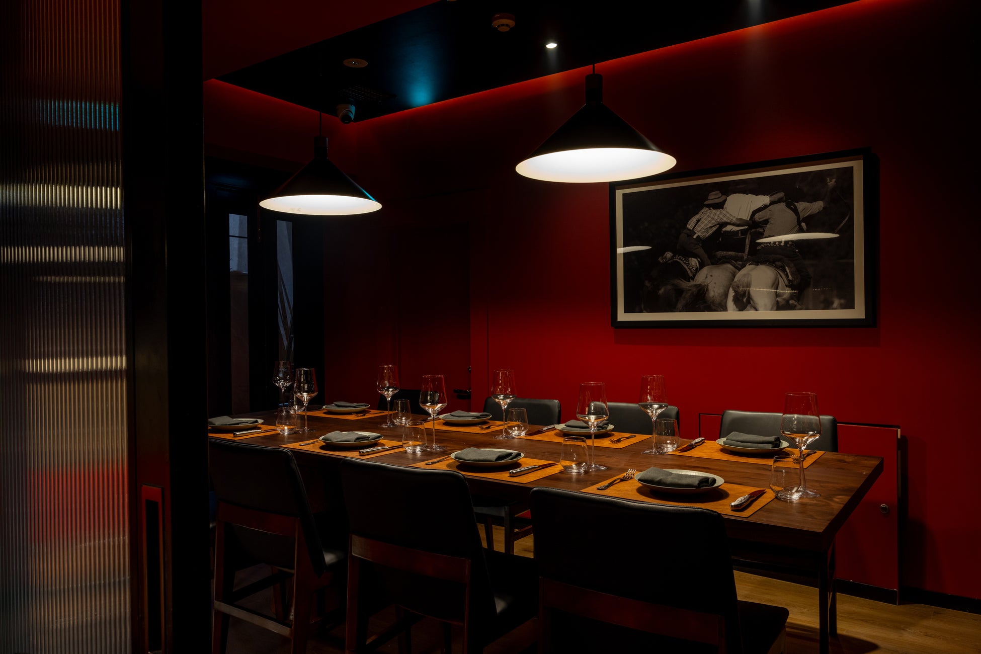 赤と黒のシックなインテリアと温かみのある照明の上質な空間で、薪で火入れしたステーキと厳選ワインをお楽しみください。2名~20名様まで個室もご利用いただけます。会食や記念日、接待など、大事な時間を、特別な空間でお過ごしください。