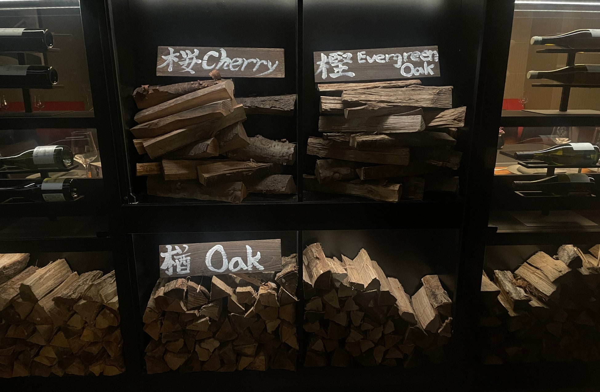 火を上げず芯だけが真っ赤に燃える“熾火”で、カシ・ナラ・サクラなどの薪を使い分けながら、素材ごとに最適な火入れを行います。
