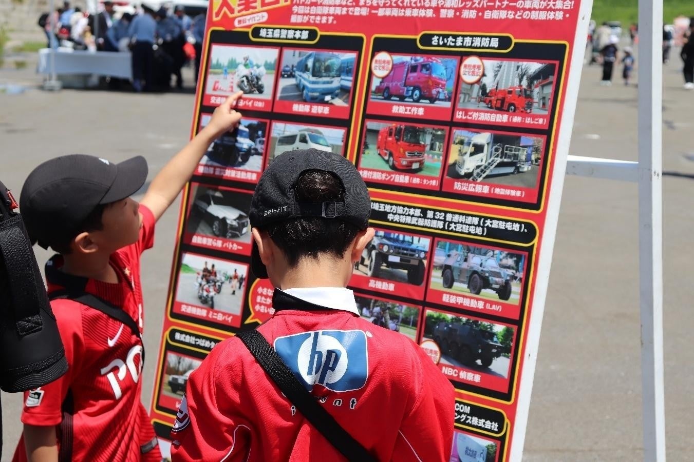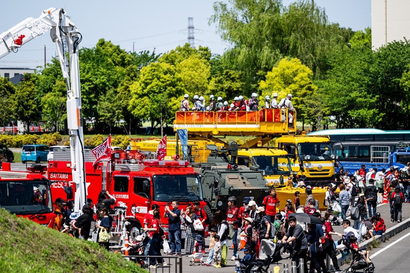 スタジアムに隣接する調節池エリアに移動してみると、白バイやパトカーをはじめとした埼玉県警察の車両、自衛隊による特殊車両、消防車両、さらに浦和レッズパートナー(スポンサー)企業のはたらく車両など、合計20種類以上が大集結していた。