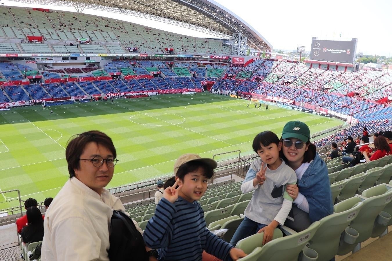 今試合は、多数のイベントが実施されたが、GoGoReds!デーの「メインイベント」はもちろんサッカー観戦。屋根付きでスタジアム全体を見渡せる「ウェルカムシート」は、初観戦にお勧めの席ということもあり、ユニフォーム姿ではない親子連れの来場者もたくさん見かけることが出来た。4人家族に声をかけてみると、「埼玉スタジアムに来たのは初めてです。今日は子どものチケットが 550 円だったので、せっかくの機会だから行ってみようとなり、栃木から来ました。スタジアムはとても広くてきれいだし、トイレも多くて分かりやすいですね」と笑顔で答えてくれた。サッカーをしている小学2年生の息子さんは、マテウス サヴィオ選手のファンということもあり、初観戦を楽しみにしていたそう。スタジアムの感想を聞いてみると、「ここ(2階席からのながめ) は高いので、ちょっとドキドキしています」とスタジアムの迫力に圧倒された様子だった。