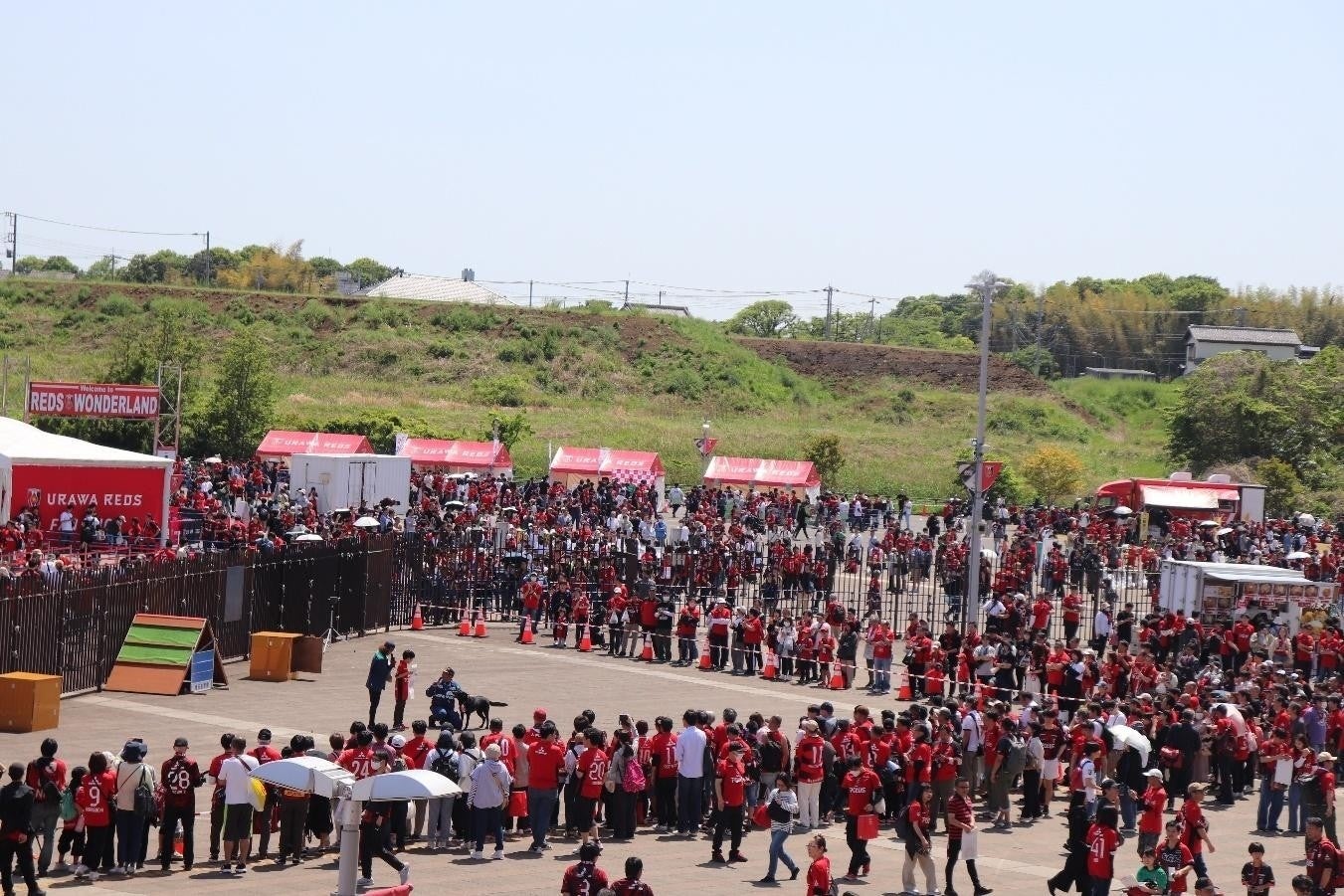 5月3日(土・祝)に埼玉スタジアムで開催された浦和レッズのホームゲームでは、ファミリー向けイベント『ゴールデン GoGoReds!デー』が開催された。年に1度の恒例イベントというGoGoReds!デーでは、小中高生指定席のほとんどが550円になるだけでなく、子どもたちが試合以外のイベントでも楽しめるイベントになっているとのこと。7 回目となる今回は、「はたらくのりもの大集合」や「警察お仕事体験」、専用通貨でお買い物体験ができる「REDS KIDS FAN SHOP」など、多彩なコンテンツが企画されたこともあり、試合開始4時間前から多くの家族連れがスタジアムを訪れ、会場は賑わいを見せていた。