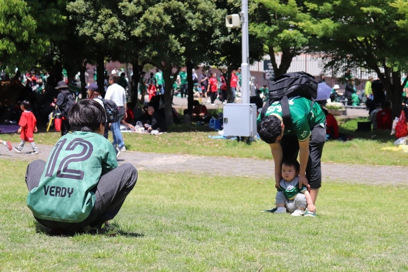ふわふわ遊具で盛り上がるエリアの横では、芝生にレジャーシートを敷いて昼食を食べながら、両チームのファン・サポーターがゆったりくつろいでいる。そんな中、東京ヴェルディのユニフォームを着たちびっこサポーターが目に留まり声をかけてみる。東京からやってきた 1 歳半のりょうが君は、今回がアウェイデビュー。お父さんによると、「初めて子どもを連れてアウェイに来たんですが、試合前の埼玉スタジアムは思っていたよりも穏やかで、イメージと違いましたね」とのこと。続けて、「レッズといえばゴール裏の激しい応援のイメージが強いですが、実際に来てみると家族連れも多くて。子どもを遊ばせる場所も整っているので、これなら小さい子どもを連れてきても安心できます」と話してくれた。