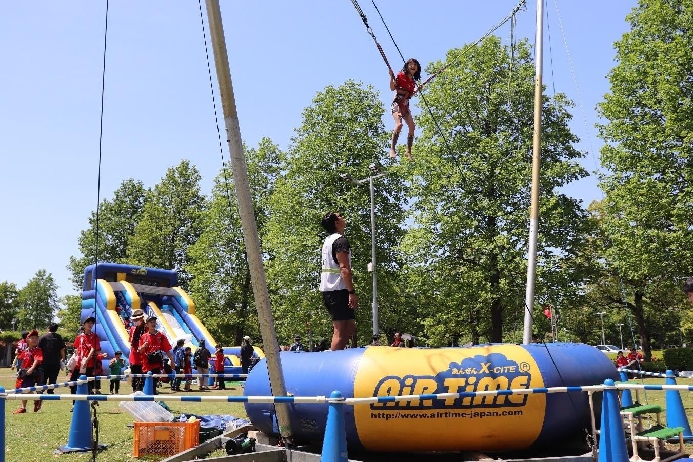 スタジアムの西側に広がるもみの木広場には、この日は特別に3 種類のふわふわ遊具が並び、子どもたちの笑い声が響く。一番人気は、最大8mの高さまで飛び上がる「バンジージャンプ」だ。多くのイベント会場でみかける「バンジージャンプ」だが、通常は数百円から1000円程度の料金がかかる。それが無料ということもあり、長蛇の列が出来ていた。何度も空中で回転しながらバンジージャンプを満喫していた女の子は、「めちゃくちゃ高くまで上がるから、スタジアムが近く見えた」と興奮気味に話し、家族とともに次のふわふわ遊具の列に並んでいた。