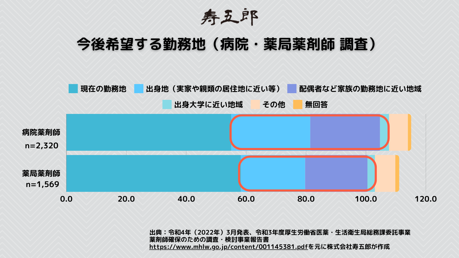 調査によれば、多くの薬剤師は現在出身地(実家や親類の居住地に近い等)で勤務しているか、または転職する際にも出身地や配偶者など家族の勤務地に近い地域、また出身大学に近い地域への就職を希望していることが分かっています。また、直近3年の雇用形態の調査結果から、病院では非常勤が 11.8%なのに対し、薬局では非常勤が 29.8%という結果がでており、このことから薬局では、二次医療圏の人口規模が大きくなると、非常勤の割合が高くなる傾向があります。薬局での働き方は病院に比べると柔軟な対応が取りやすい状況にあることが考えられ、これらの結果を踏まえ、寿五郎は薬剤師はUターン、Iターン、Jターン就職だけでなく、薬剤師の働きやすさにも注目し、地域社会における医療提供体制の充実に努めてまいります。