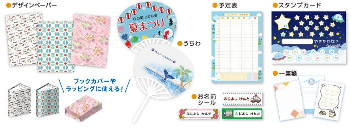 パソコンを使った印刷は、はがき作成だけではありません。色々な用途で使用することができます。デザインペーパーのデザインを印刷し、ラッピングに使用。小学生向けの素材として絵日記、時間割、お名前シール、スタンプカードなど日常で使うグッズのデザインを印刷することができます。また、贈り物や返信の際の一言のありがとうを伝える一筆箋向けのレイアウトデータも用意しました。