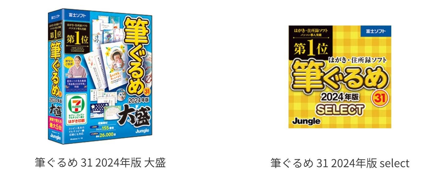 株式会社 ジャングル(本社:東京都千代田区、代表取締役 高田晃子 以下、ジャングル)は、富士ソフト株式会社(東証一部:9749 本社:神奈川県横浜市、代表取締役 社長執行役員 坂下 智保 以下、富士ソフト)が開発している1年を通して利用できるはがき作成・住所録管理ソフト『筆ぐるめ 31 2024年版 大盛』と、厳選素材をセレクトして収録した低価格版の『筆ぐるめ 31 2024年版 select』を 2024年2月8日(木)より全国の家電量販店および EC サイトで一斉に販売開始いたします。