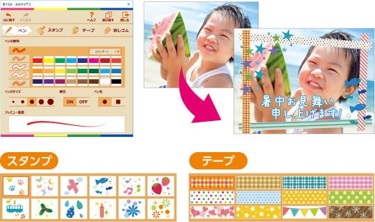 写真付きはがきなどの作成時にプレビュー画面で直接お絵かきができます。「ペン」でお絵かき、豊富な「スタンプ」や「テープ」でデコレーションを楽しみながらオリジナルのはがきを作成できます。